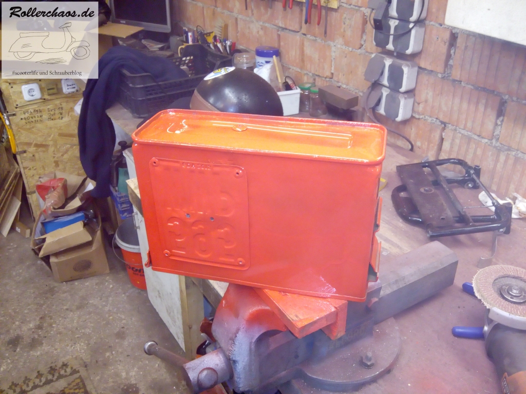 Unter einer frischen Schicht roter Farbe (Restmaterial vom Chinakracher) sieht die alte Kiste doch gleich viel ziviler und freundlicher aus.