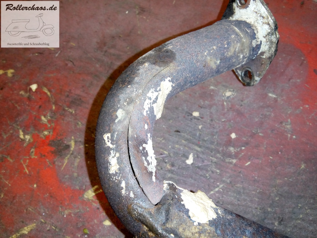Die Freude am "neuen" Auspuff währte jedoch nicht lange. Kurz nach dem letzten Fotostopp wurde der Roller bestialisch laut und richtig langsam. Der Grund: Der Auspuff war so rostig, dass der Krümmer regelrecht zerbröselt ist. Schade, das wäre dann wohl zu einfach gewesen. Schlimme ist es eigentlich nicht, der Roller hat mit mit einem "Notverband" aus Panzertape zuverlässig (wenn auch recht ohrenbetäubend) nach Hause gebracht, aber schade ist halt, dass der Roller schon wieder gegroundet ist.