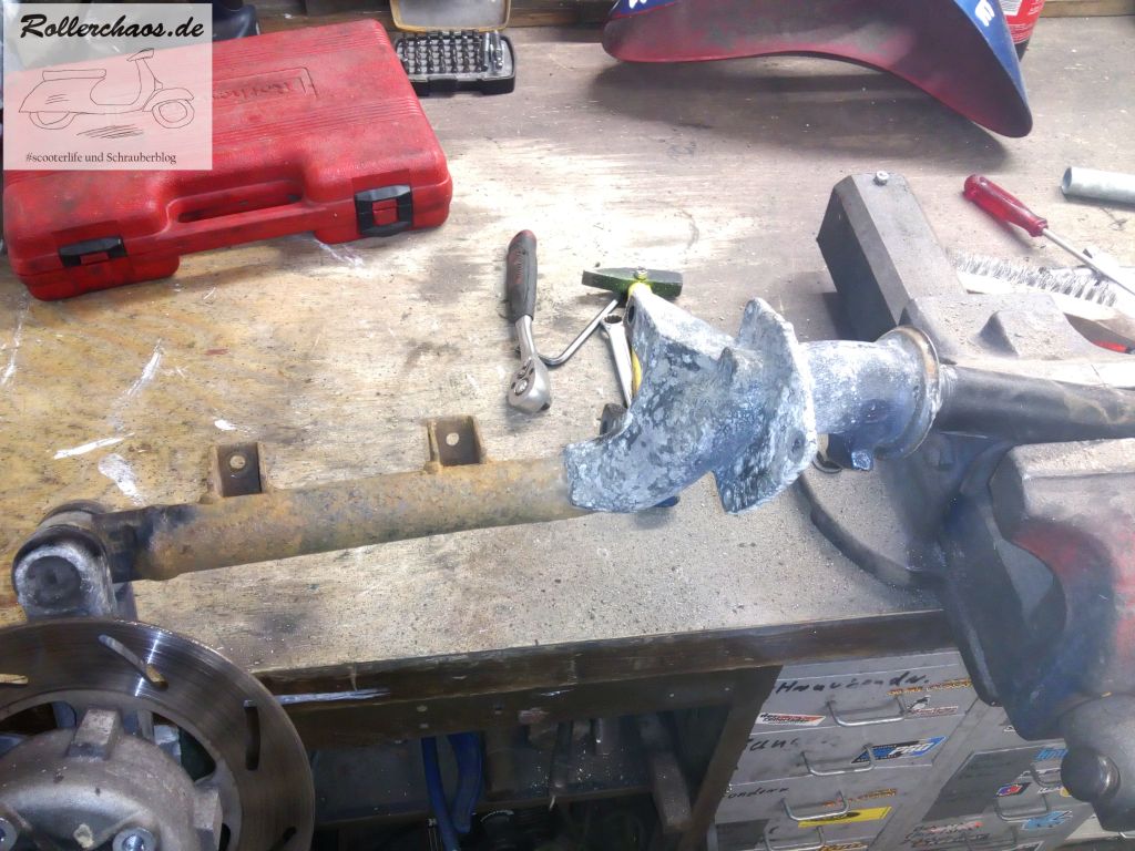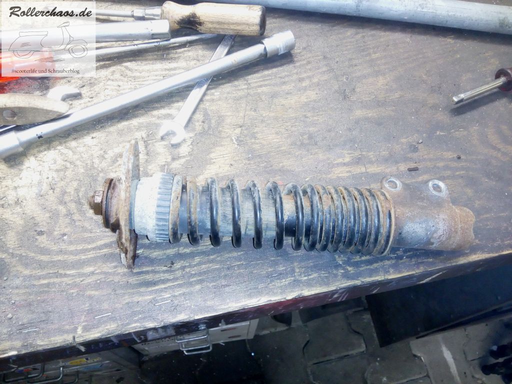 Dafür ist die Gabel umso fertiger. Vermutlich zum ersten Mal seit 1996 ist sie jetzt aus dem Roller raus und zeigt deutlich die Spuren der Jahre. Immerhin ist das Schwingenlager noch in Ordnung, der Stoßdämpfer hat es aber hinter sich.