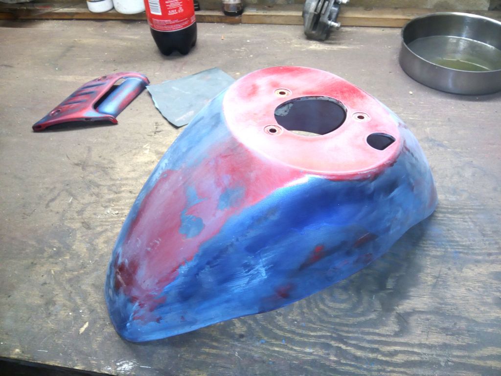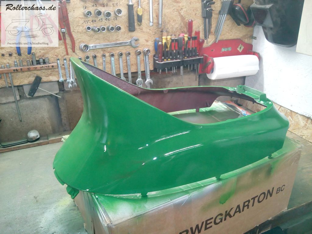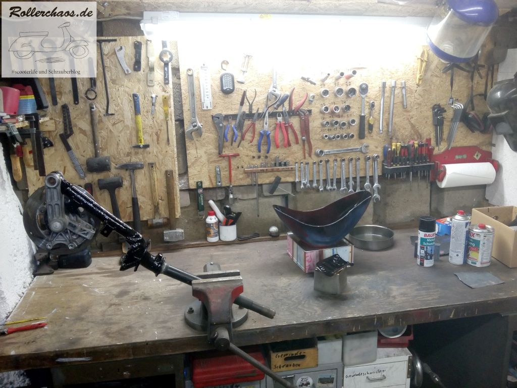 Heute war ich nochmal in der Werkstatt draußen, eigentlich nicht um am Zip zu arbeiten, sondern um die Ape reiseklar zu machen. Am Dienstag geht es ja wieder auf Tour, aber die Gelegenheit war natürlich günstig um noch etwas Farbe zu verspritzen.