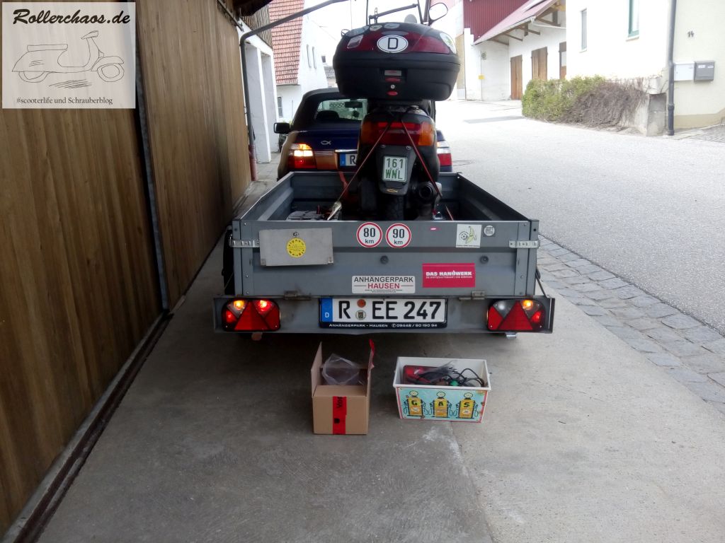 Der Anhänger braucht TÜV, also eigentlich schon seit letztem Monat, aber manchmal klappen solche Dinge eben nicht reibungslos. Beim ersten HU-Termin flog das Anhängsel wegen eines ausgelulleretn Zugmauls durch, beim zweiten wegen nicht ordentlich funktionierender Beleuchtung. Bei näherer Betrachtung zeigte sich, dass die Rückleuchten innerlich völlig vergammelt waren, hier musste Neuware her. Also stand heute Anhängerschrauben auf dem Programm.