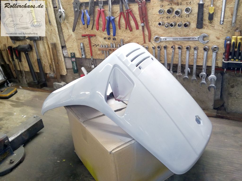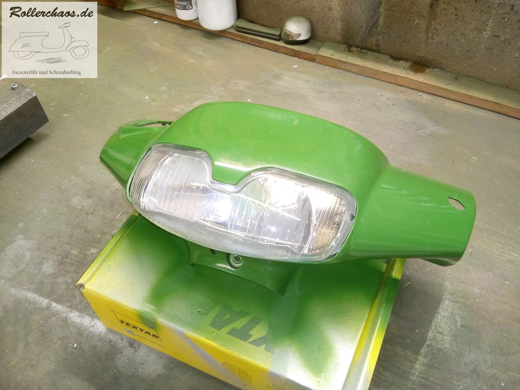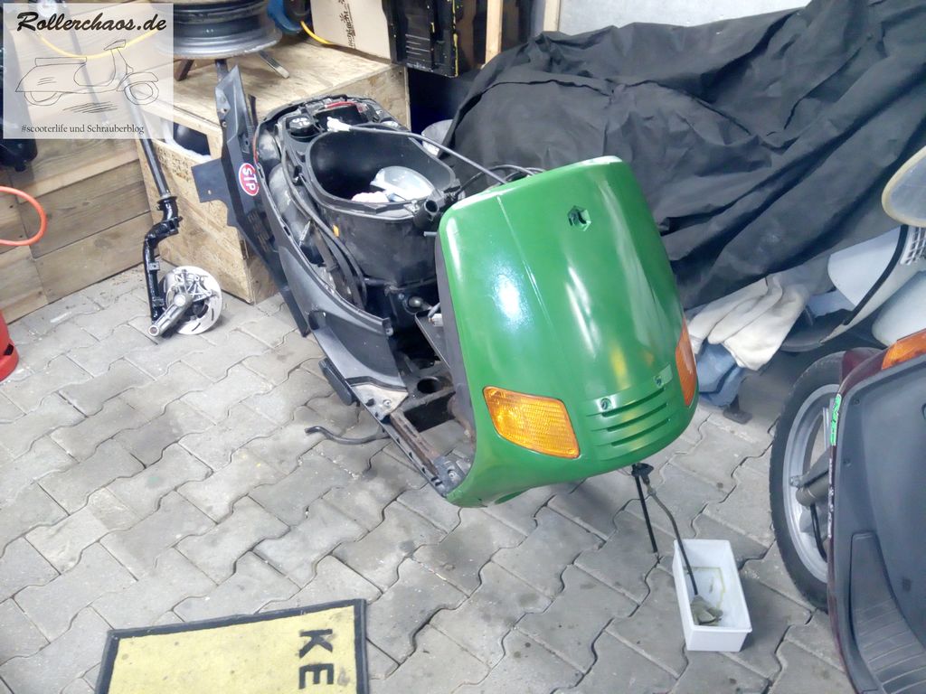 Die Frontmaske war derweil soweit fertig und trocken. Darum kam sie gleich zurück an den Roller, dieses Teil ist ja auch besonders wichtig, denn es muss dran bevor die Gabel wieder eingebaut werden kann. Jetzt heißt es auf die bestellten Ersatzteile für die Gabel warten, den Urlaub genießen und dann weiter machen.