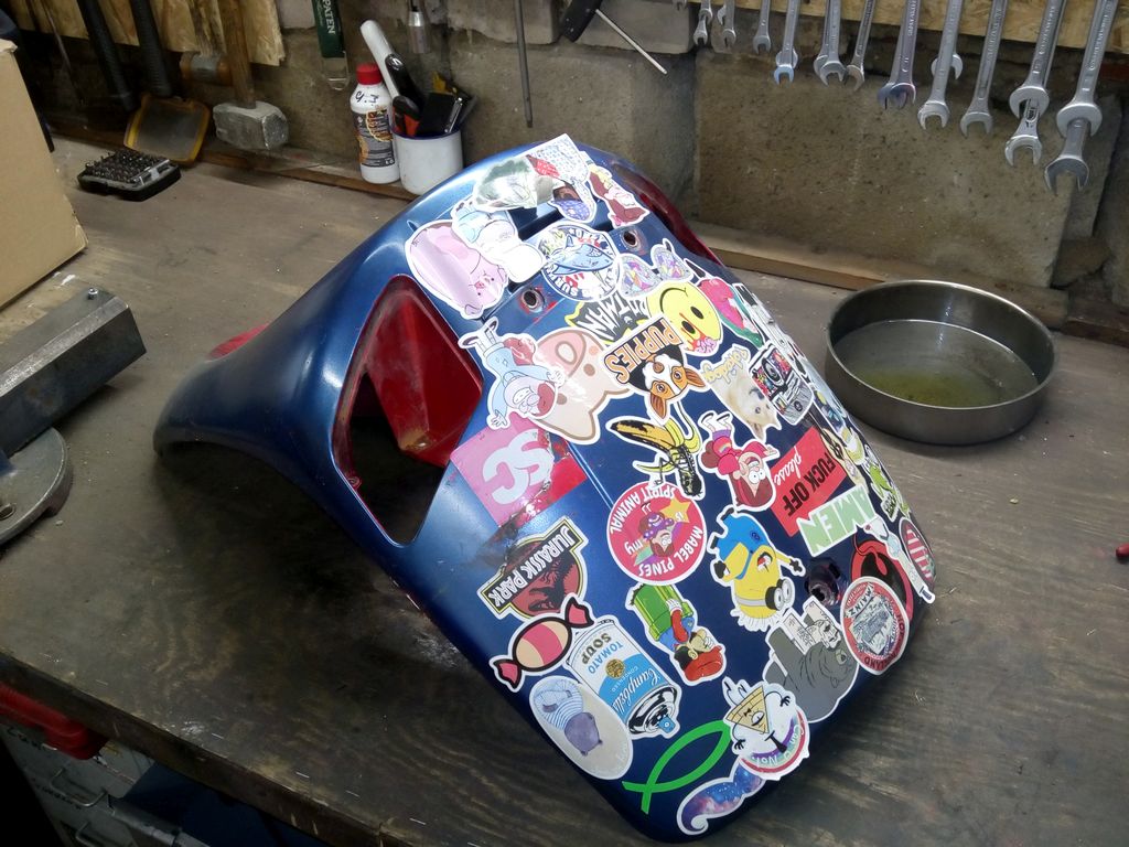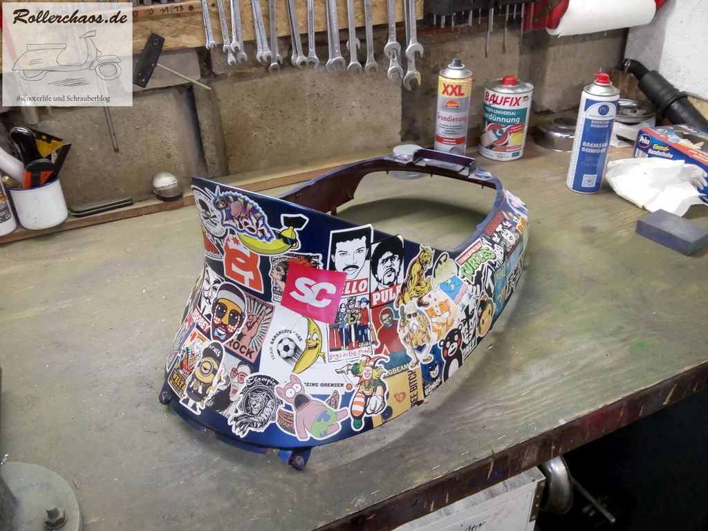 Dafür ging es dem Zip dann ans Plastikkleidchen. Ich hatte es ja vor einiger Zeit schon mal geschrieben: Ich kann das Stickerbombing nicht mehr sehen, die völlig verkorkste blaue Lackierung vom Vorbesitzer ist aber auch gruselig, es hilft also nichts.