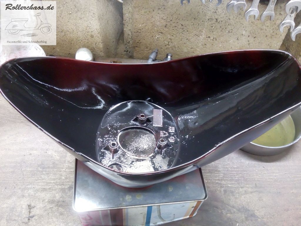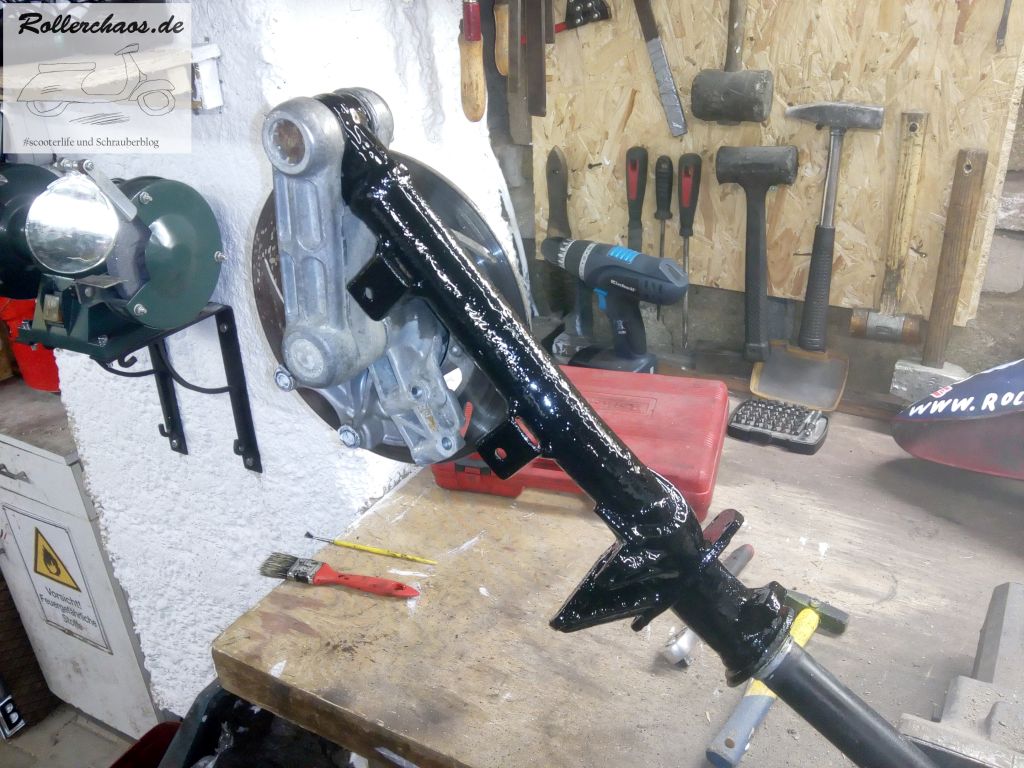 Denn man sieht bei beiden Teilen in einigen Winkeln die Innenseite. Hier war der Roller aber immer noch im Originallack, also rot. Das würde beim geplanten Farbschema brutal herrausstechen. Darum habe ich den Kotflügel innen und die Rückseite der Stoßdämpferabdeckung schwarz überlackiert.
