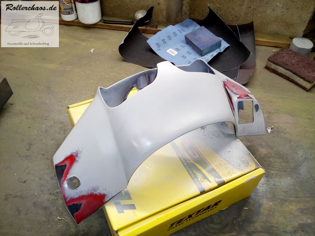 Nach der "Reparatur" ging es dann mit der Schleiforgie weiter. Zumindest die gröbsten Schrammen sind raus. Zeit für den Primer.