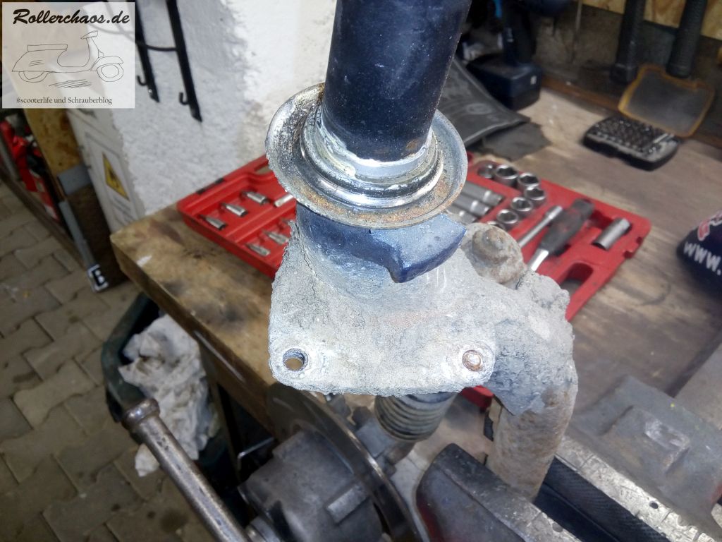 Ursache dafür, dass der Zip so wahnsinnig schlecht Lackiert ist, ist wohl der Aufwand für eine Demontage der Frontmaske. Um diese abbauen zu können, muss die Gabel raus. Das war aber sowieso fällig, denn das Lenkkopflager fühlte sich schon länger nicht mehr gut an. Nach dem, wie beim Zip üblich ziemlich zähen, abnehmen des Lenkers war auch klar warum. Wie so oft ist der obere Kugelring völlig hinüber.