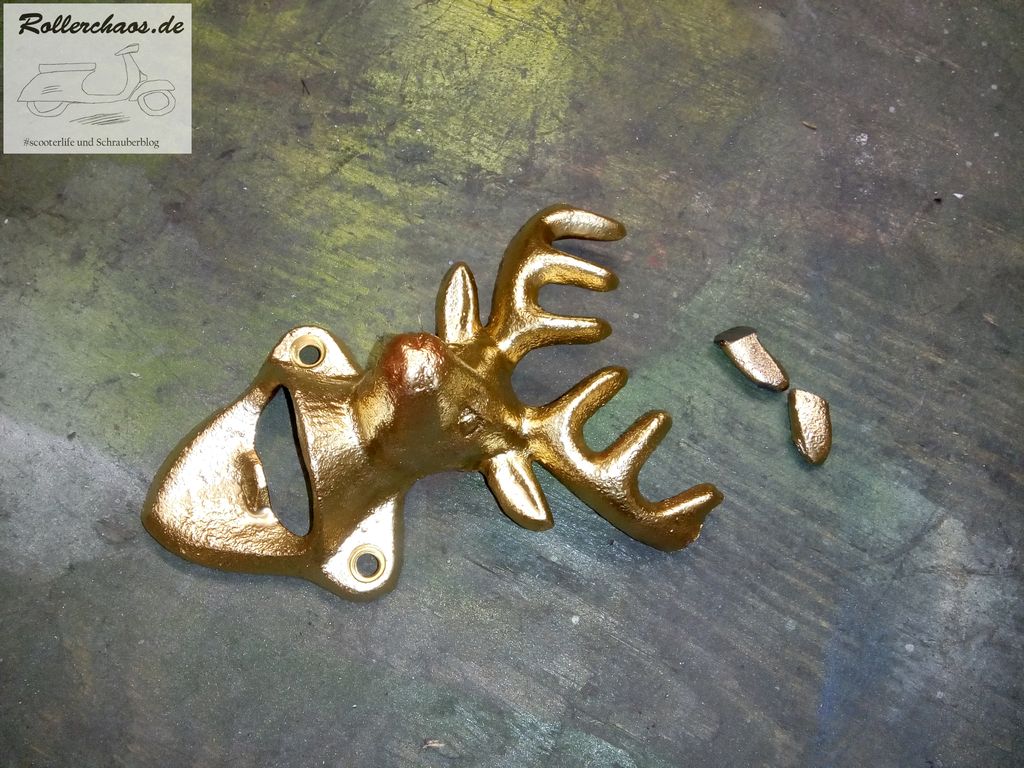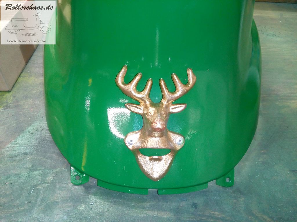 Der Hirsch kommt in den Durchstieg, über der Wartungsklappe ist ein guter Platz. Denn hier stört er nicht und stellt keine Gefahr da. Außerdem ist er nicht sofort zu sehen, ein Gag für Leute die sich den Roller genauer anschauen ist irgendwie spannender als die Torte im Gesicht. Zudem, was ja auch nicht unwichtig ist, ist er hier tatsächlich als Falschenöffner benutzbar.