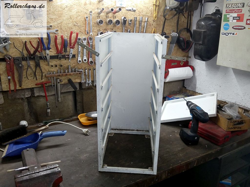 Darum stand heute nur etwas Ordnung auf dem Programm. Die Schubladenelemente unter der Werkbank sind super. Bei dem weißen drückt es aber immer wieder die Rückwand raus. Grund dafür ist die flimsige Befestigung. Hier war etwas zusätzliche Stabilität gefragt.
