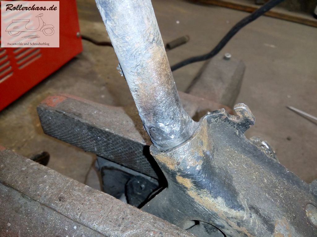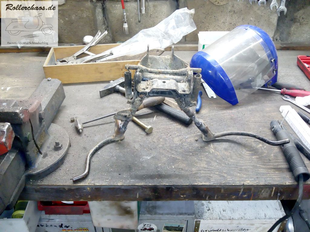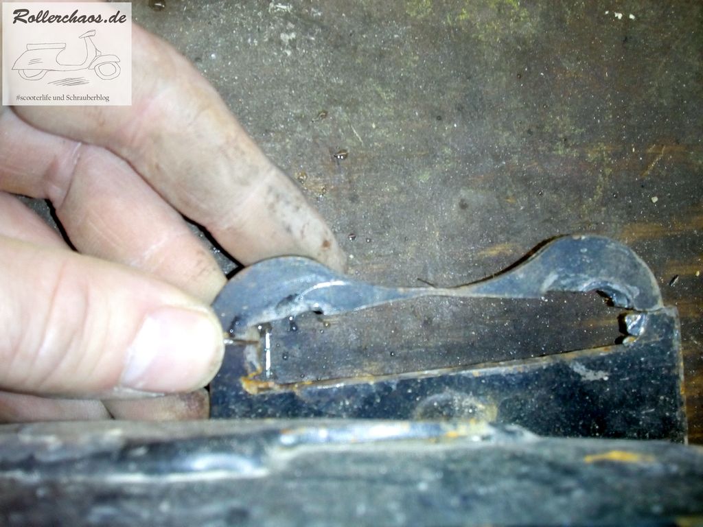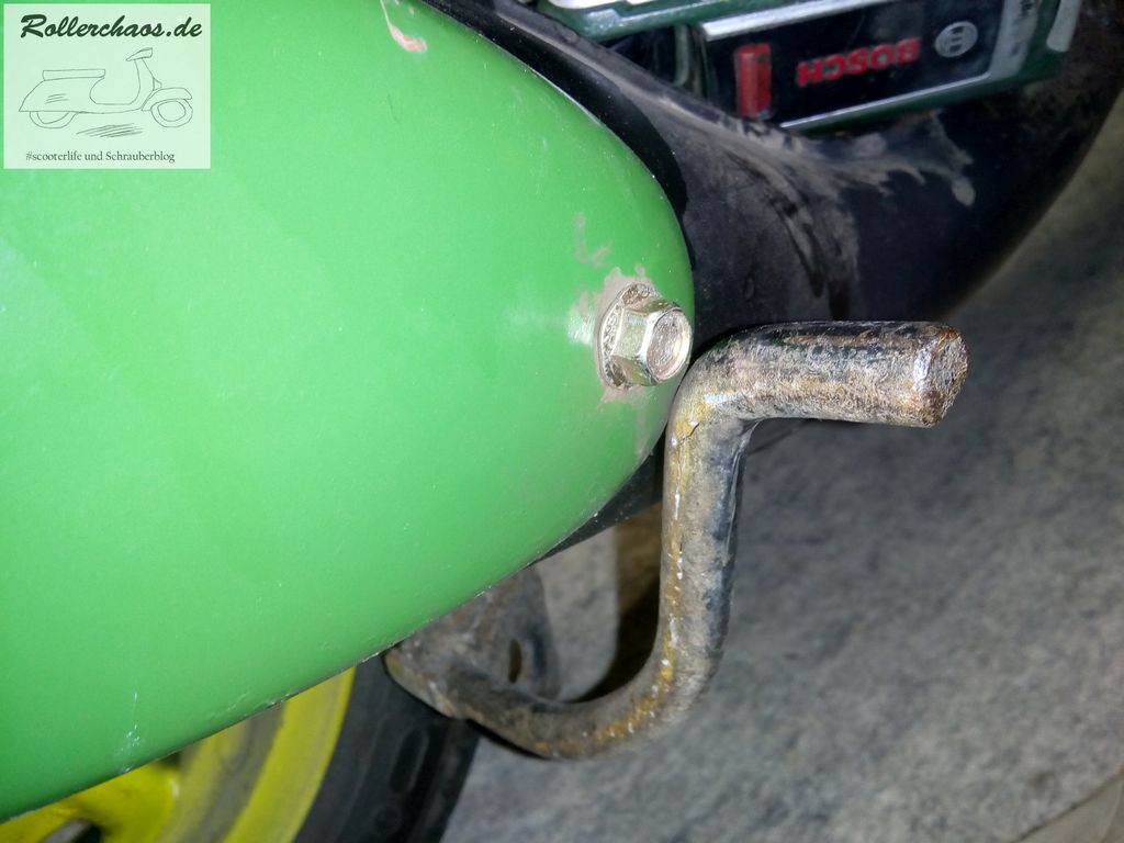 Nach der Demontage des Ständers, die ja bei diesen alten Piaggios denkbar einfach ist, war dann die Schleifstelle schön zu sehen.