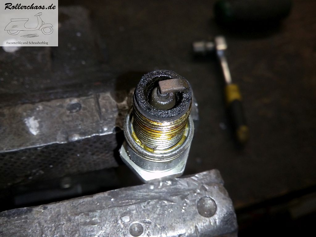 Die Zündkerze zeigt deutlich, dass ein neuer Luftfilter sicher kein Luxus ist. Außerdem ist die Elektrode gut runter gebrannt.