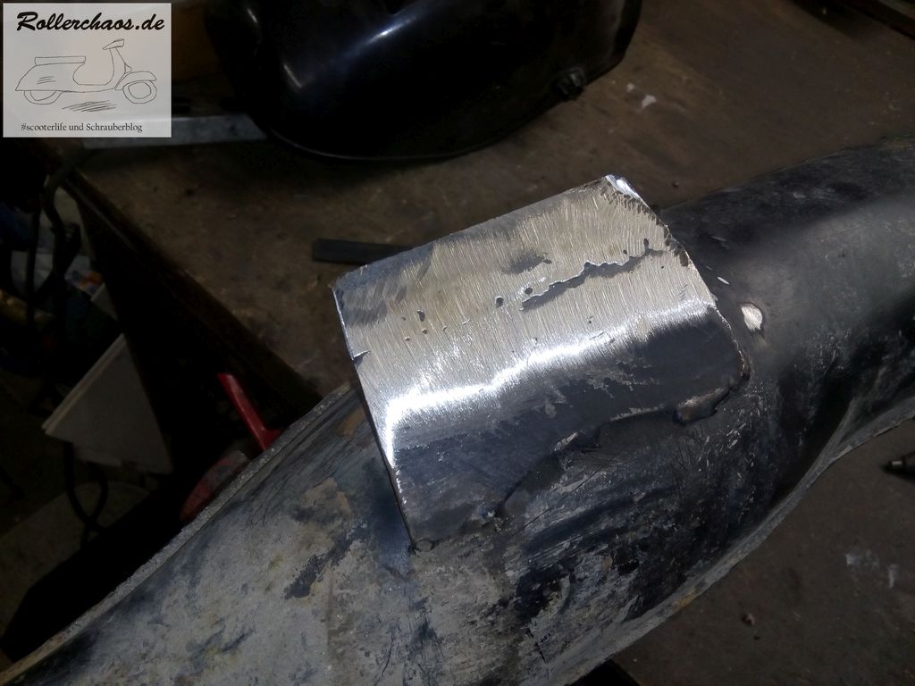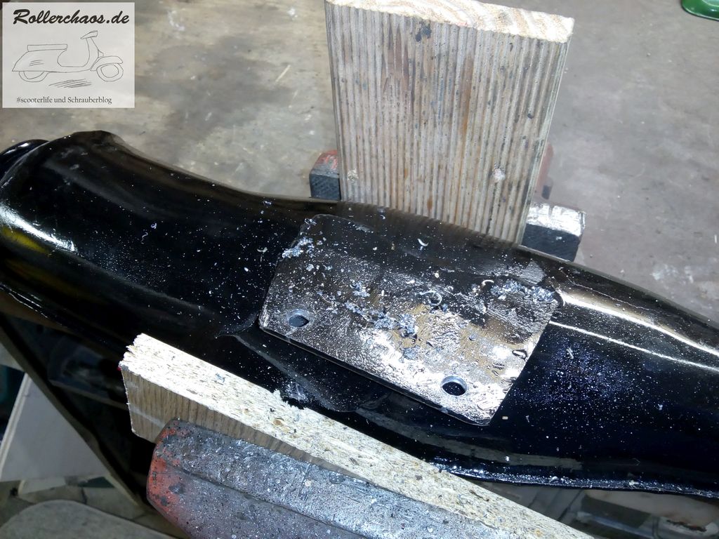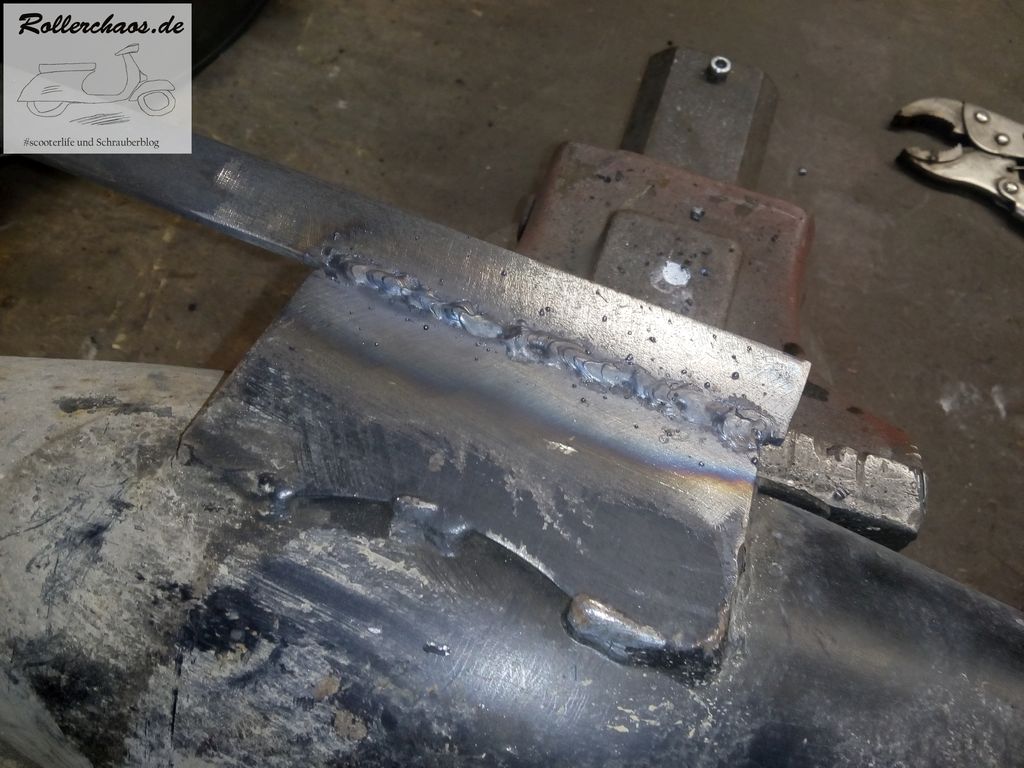 Ein Stück Flachstahl anzuschweißen und passend zurecht zu stutzen war hier die beste Lösung. Natürlich gingen so die Montagepunkte verloren. Neue bohren ist kein Problem, aber das mache ich dann genau auf Maß am Roller. Dazu fehlte mir heute aber noch das passende Fahrzeug in der Werkstatt.