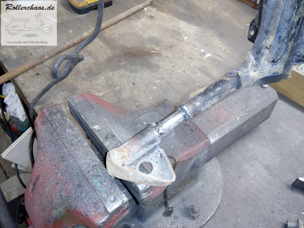 Am Hauptständer hatte ich letztens ja schon gearbeitet. Allerdings waren die Ausleger noch immer nicht optimal. Durch die Richtarbeiten am rechten Ausleger hatte sich der linke gezogen. Der Roller pendelte so immer zwischen den beiden Auslegern hin und her, sicherer Stand war so nicht gegeben.