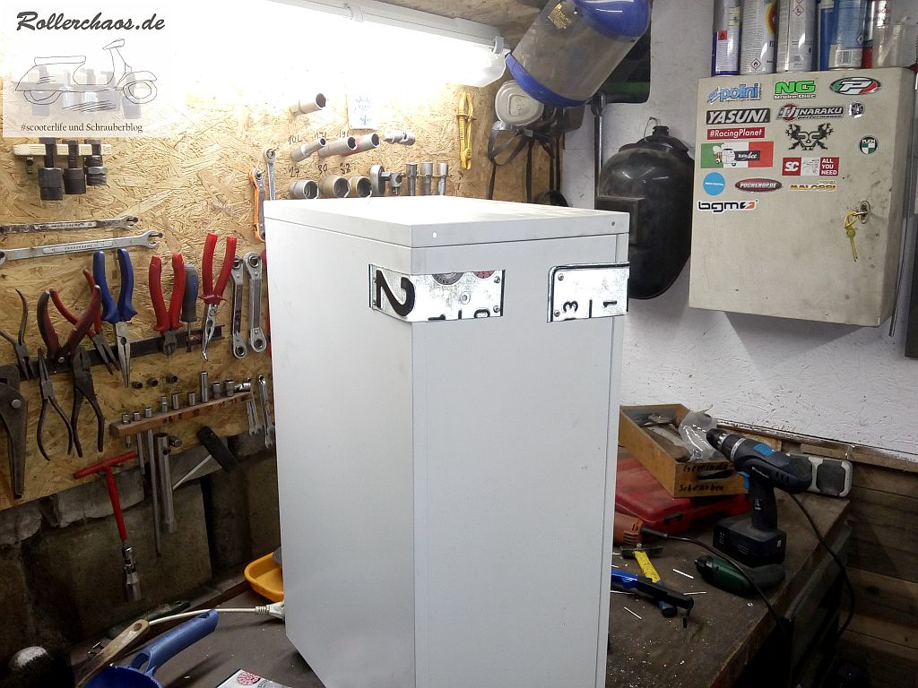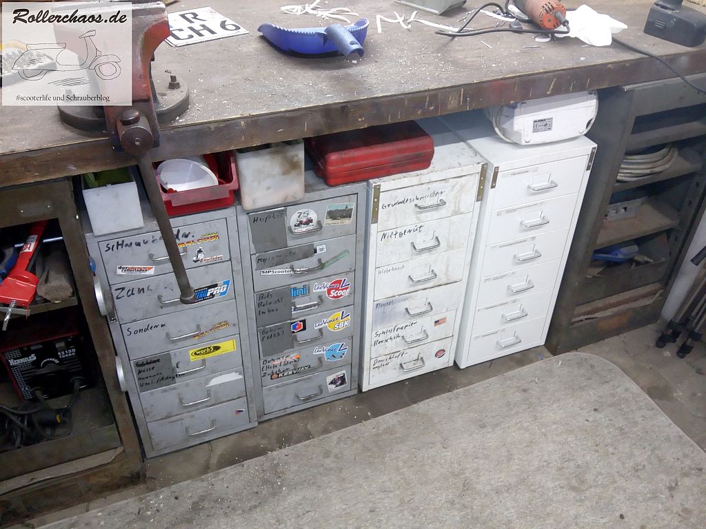 Wie immer sind alte Nummernschilder eine super Lösung für allerlei Probleme. Bis vor kurzem tat ein baugleiches Schubladenelement in meinem Heimbüro dienst. Dieses ist nun aber einem kleinen Umbau zum Opfer gefallen, weshalb es ab sofort auch in der Werkstatt stehen wird.