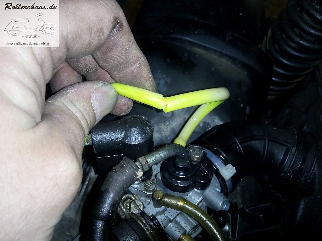 Ursache für den Spritverlust war eine völlig verhärtete und darum gebrochene Benzinleitung. Die bunten Schläuche sind einfach Mist, wobei dieser jetzt doch einige Jahre gehalten hat.