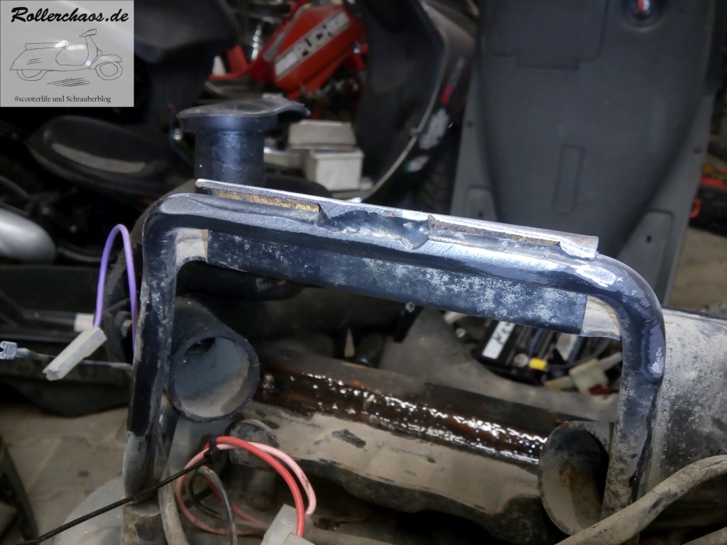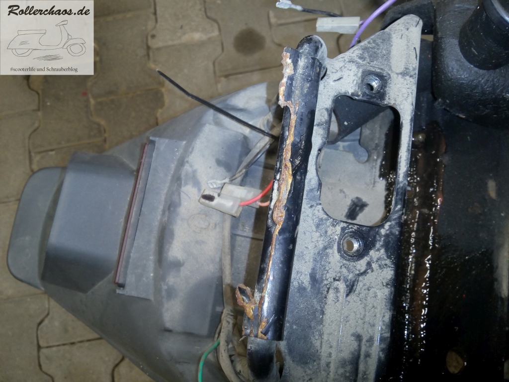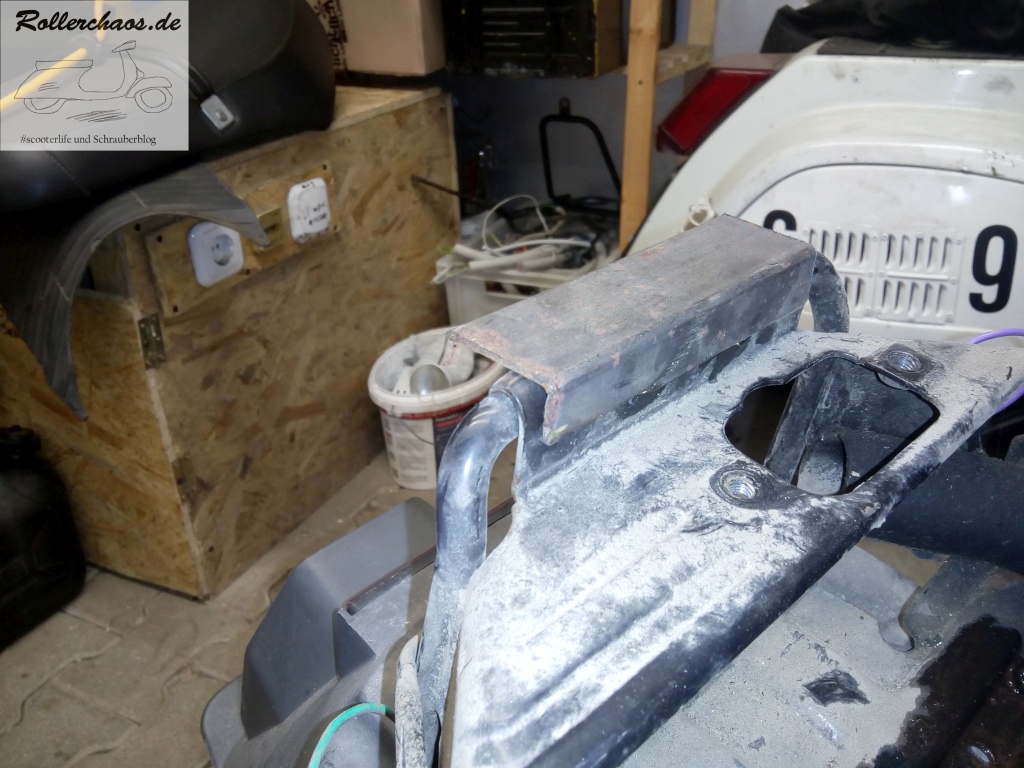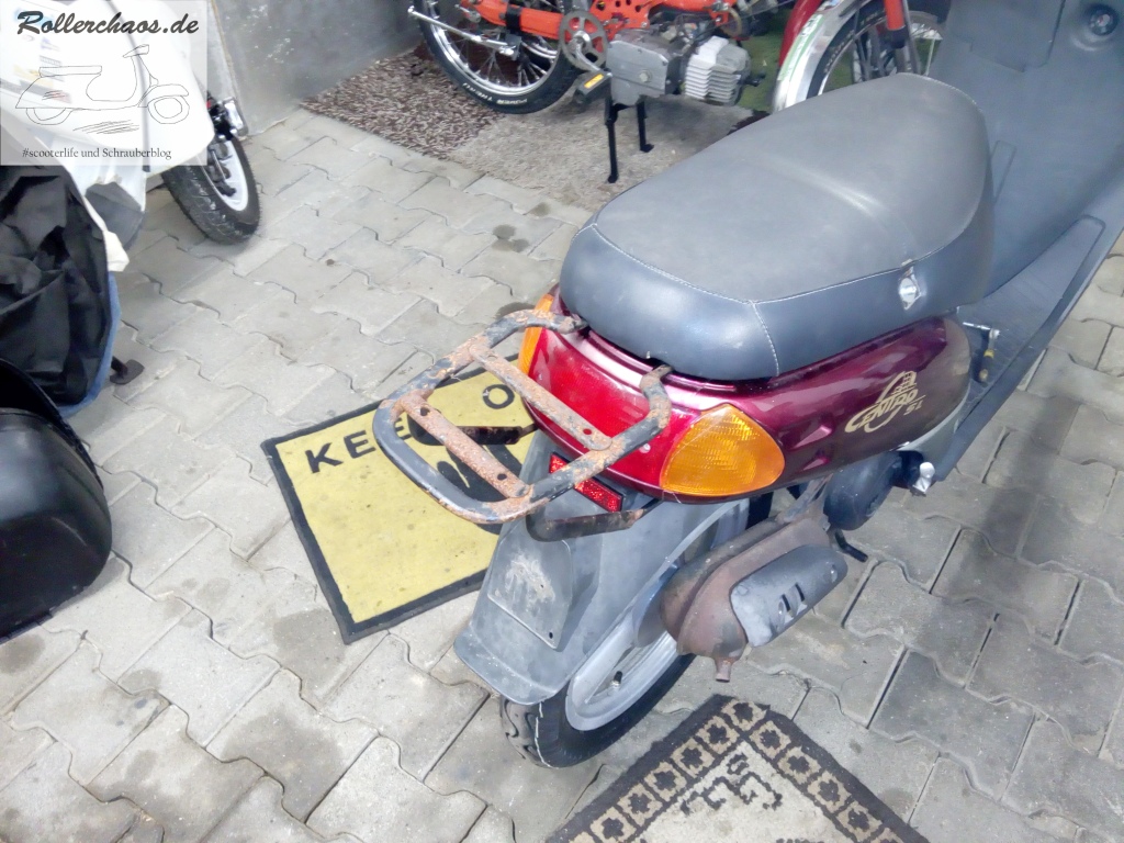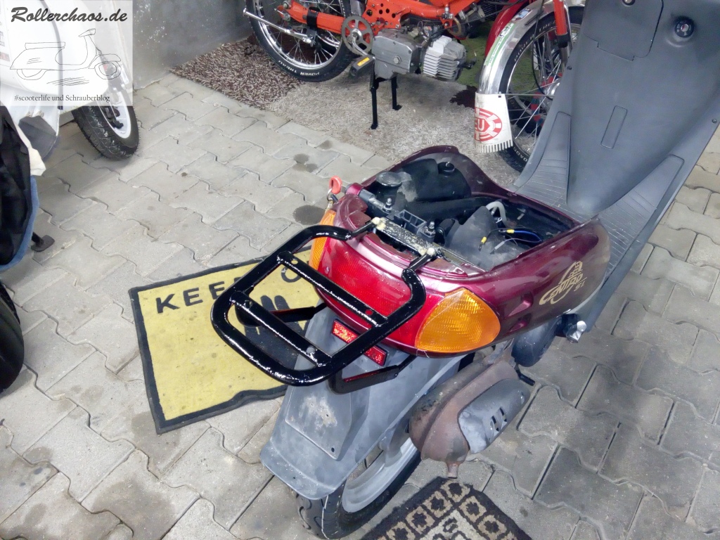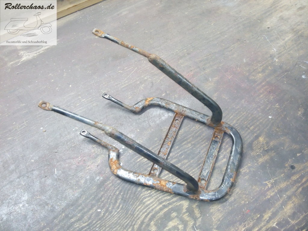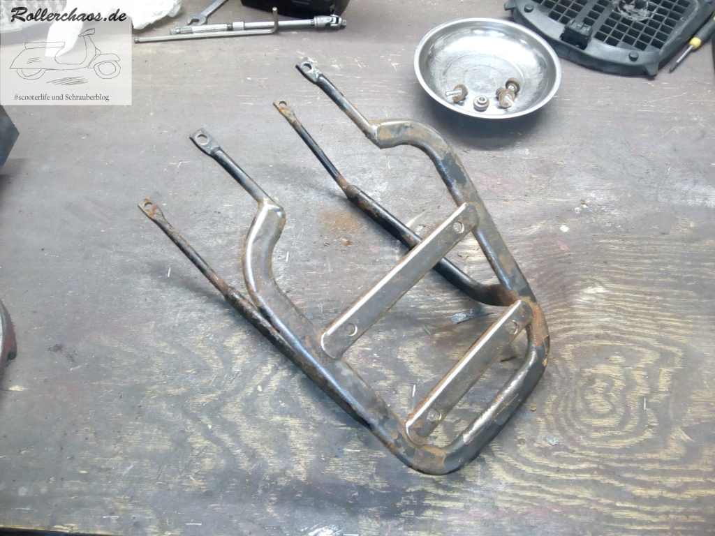 Hauptziel war für heute aber die Montage einer Rarität: Eines originalen Gepäckträgers für den Centro. Das seltene Teile hatte mir ein Bekannter aus Italien zukommen lassen. Leider mit heftigem Oberflächenrost sowie deutlichem Verzug, da von einem ausgeschlachteten Unfallroller entnommen. Normalerweise würde so ein Gepäckträger im Schrott landen, aber rare Originalteile verdienen eben immer einen Rettungsversuch.