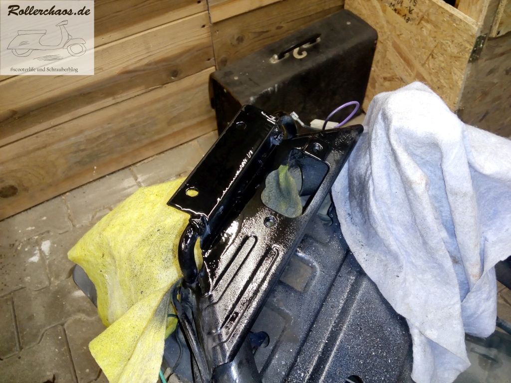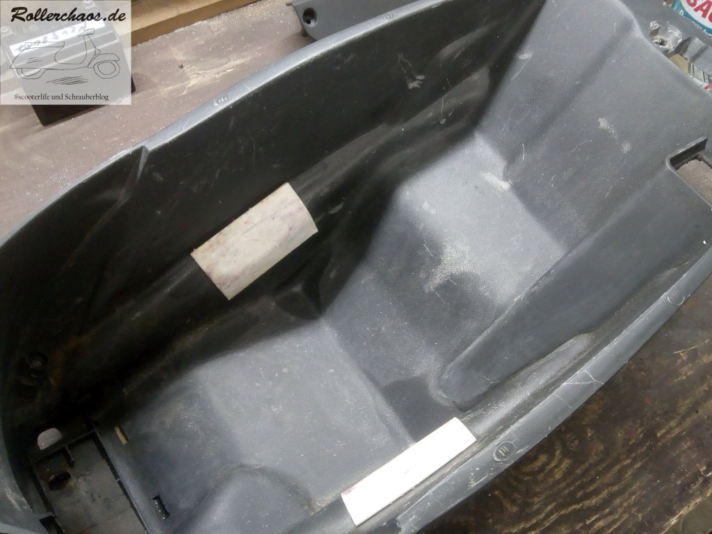 Das Helmfach habe ich dann erstmal grob mit Verdünnung ausgewischt. So sind die Klebereste und der uralte Schmier erstmal weg. Man sieht halt deutlich, dass der Roller ernsthaft benutzt wurde. Eine Kur mit Kunststoffpflegemittel wird aber trotzdem nicht schaden.