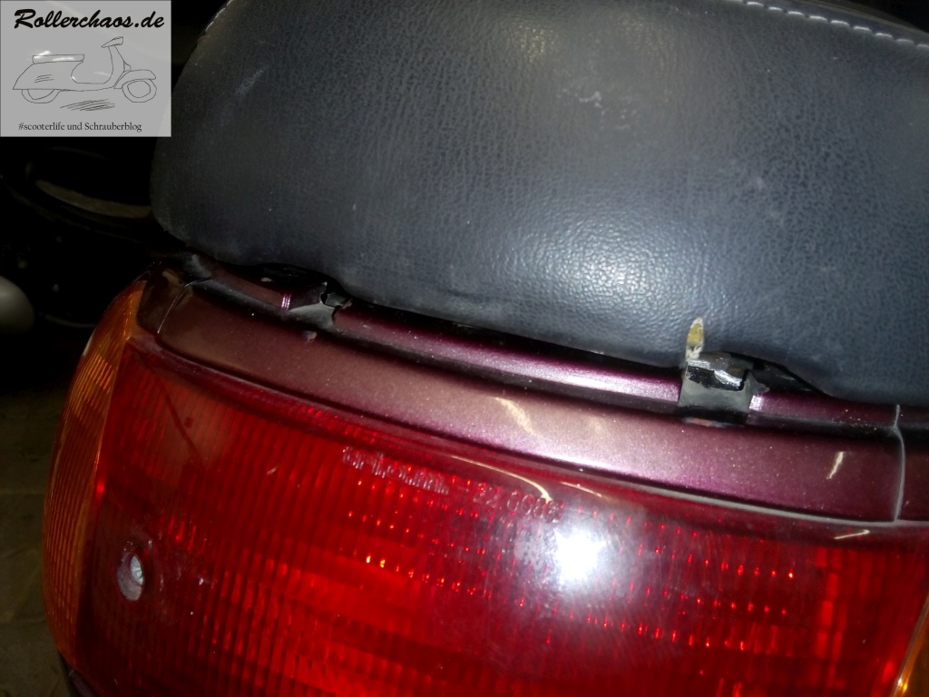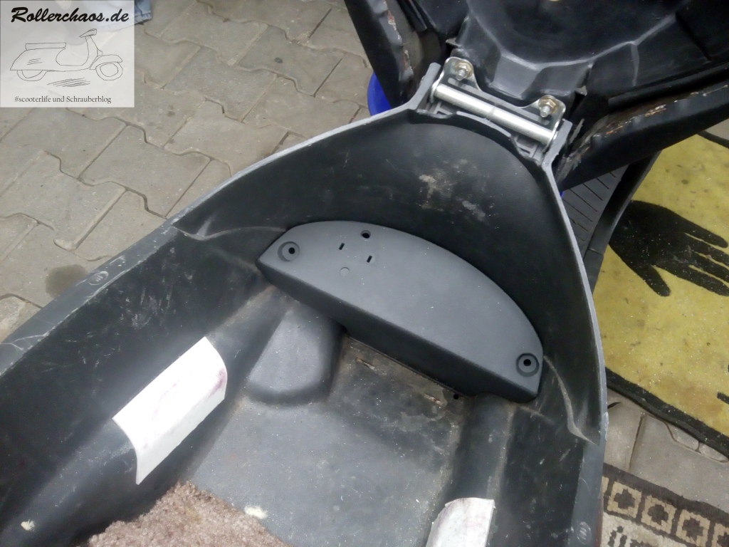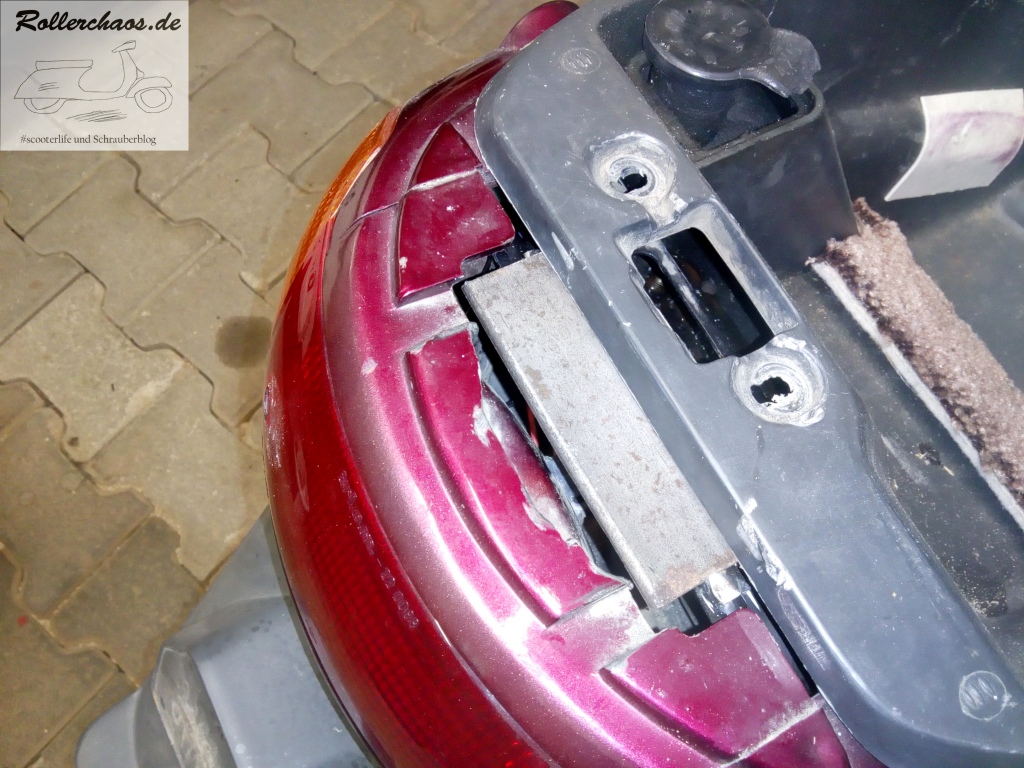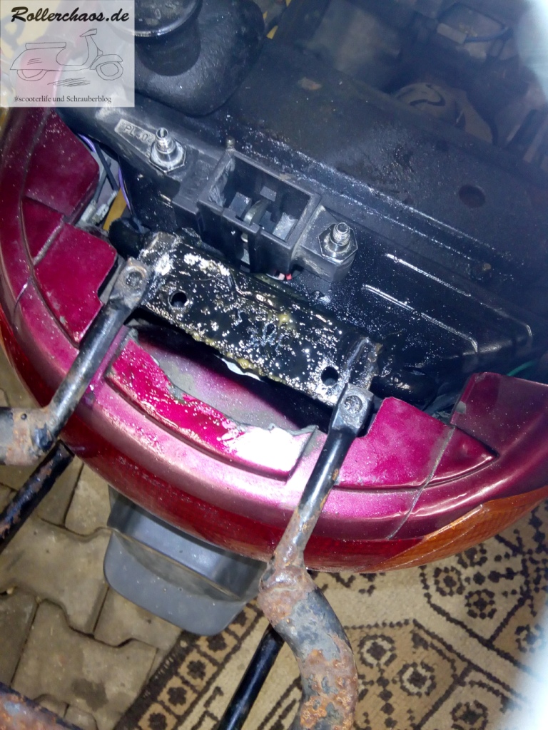 Noch nicht abgeschlossen ist dafür die Sache mit dem Gepäckträger. Nach der Probefahrt war mir aufgefallen, dass sich die Metallplatte etwas mehr bewegt als sie eigentlich sollte, die Ursache hatte ich bisher nicht gesucht. Darum kam heute doch die Heckverkleidung nochmal runter.