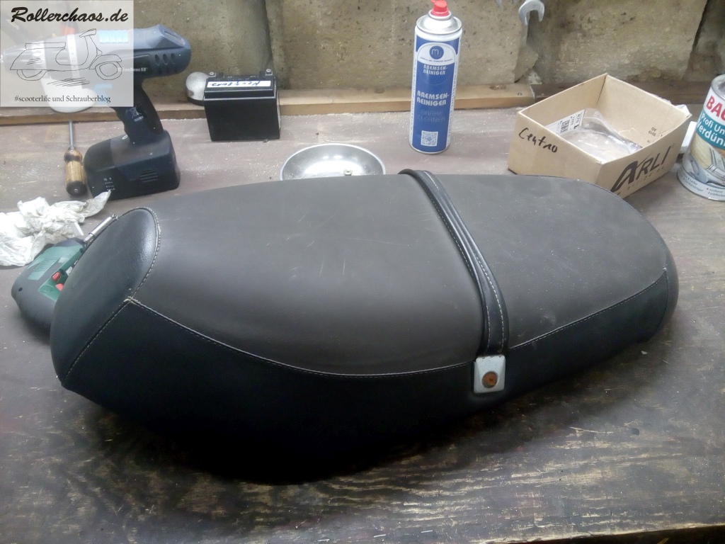 Dieser ließ sich jedoch gut abschrauben. Die beiden Löcher habe ich, wie üblich, mit Schrauben und Karosseriescheiben verschlossen. Auch so ein klassisches Merkmal eines Speedguru-Rollers. Der Hocker selbst muss aber noch gründlich geschrubbt werden, die vielen Jahre Standzeit in der Garage haben auch hier deutliche Spuren hinterlassen. So langsam wirds aber mein Roller, auch wenn das Projekt sicher noch ein bisschen Arbeit erfordern wird.