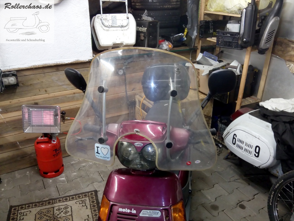 Noch offen war hingegen eine Lösung für das Windschildproblem. Originale Windschilder sind in Italien durchaus zu bekommen, allerdings extrem teuer. Etwas Recherche hatte zu Tage gefördert, dass der Windschild des Piaggio Zip SSL an den Centro SL passt, folglich sollte auch ein Cosa-Windschild montierbar sein, da dieses relativ gut an den Zip passt. Einen solchen Windschild hatte ich noch im Fundus und siehe da: Er passt tatsächlich recht gut, nur die Aussparung für den Scheinwerfer ist zu klein.