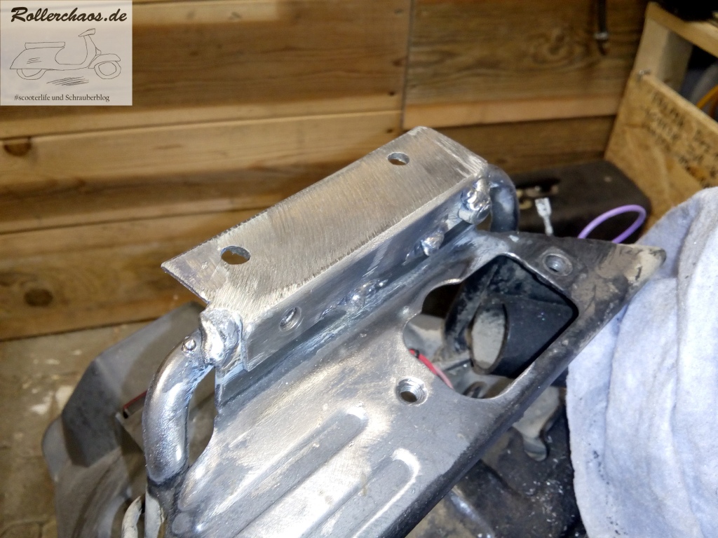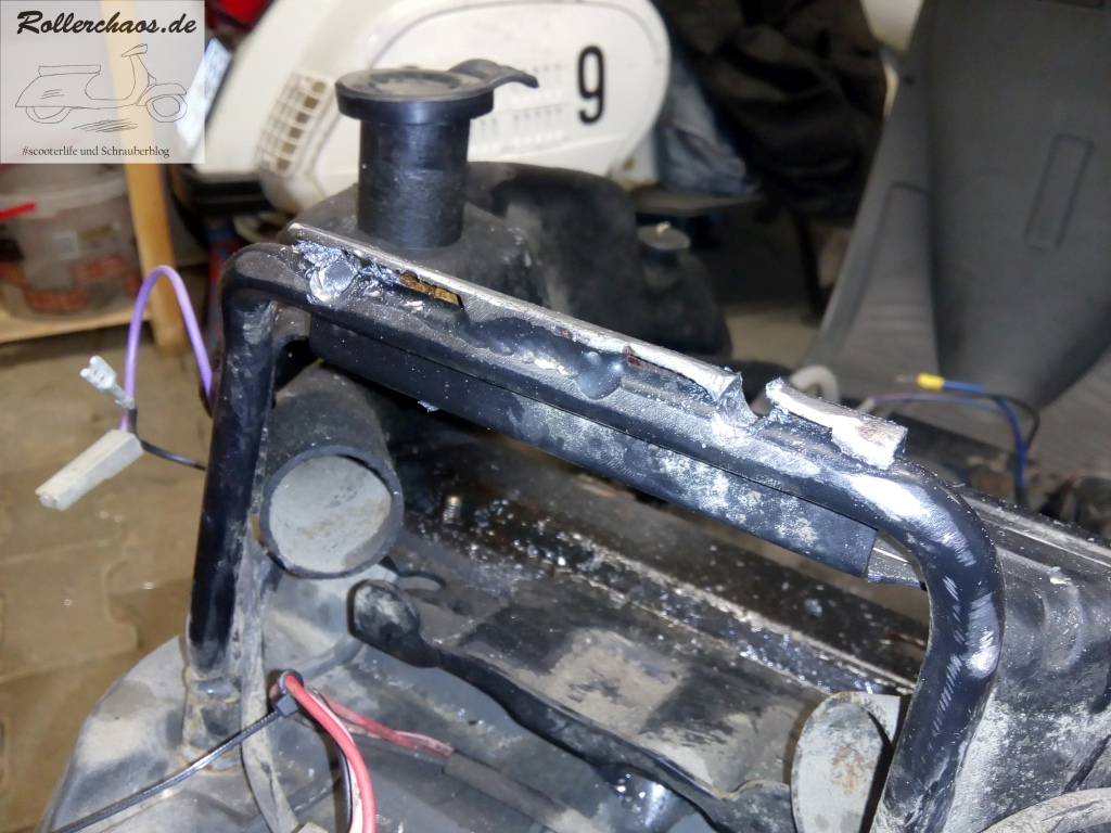 Darum habe ich mein Winkeleisen jetzt doch angeschweißt. In diesem neutralen Bereich des Rahmens habe ich damit keine allzu große Schmerzen, allerdings ist mein Schweißgerät für solche Arbeiten nur sehr bedingt geeignet. Es wird wirklich Zeit, dass ich vom alten Elektrodenbruzzler auf ein vernünftiges Gerät umsteige.