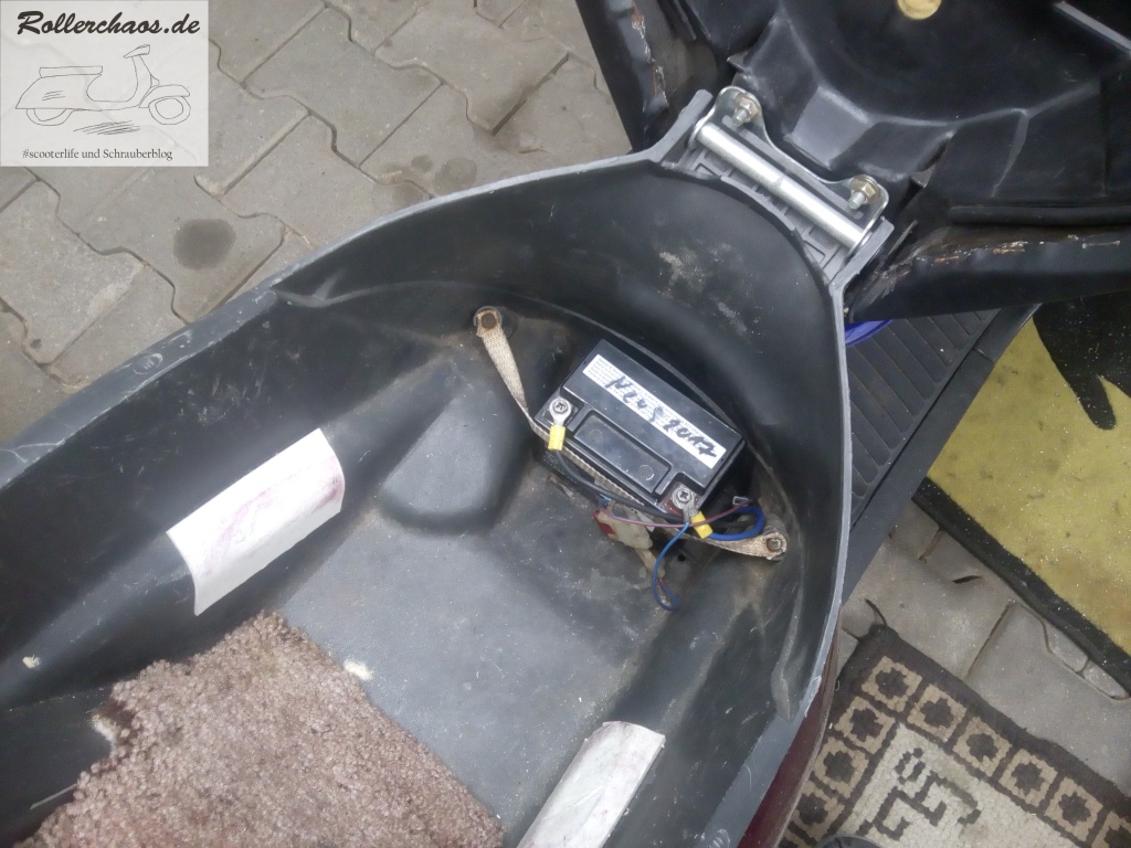 Der Vorbesitzer hatte hier kreativ gebastelt, immerhin konnte die Batterie so nicht lose im Helmfach herumfliegen. Wirklich schön und sicher ist das aber trotzdem nicht.