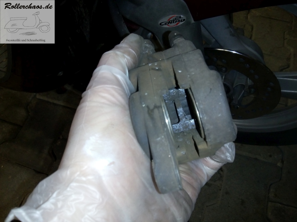 Das Vorderrad ließ sich glücklicherweise problemlos ausbauen und die Bremsbeläge gingen ohne Schwierigkeiten aus dem, völlig sauberen und rostfreien (!) Bremssattel heraus.