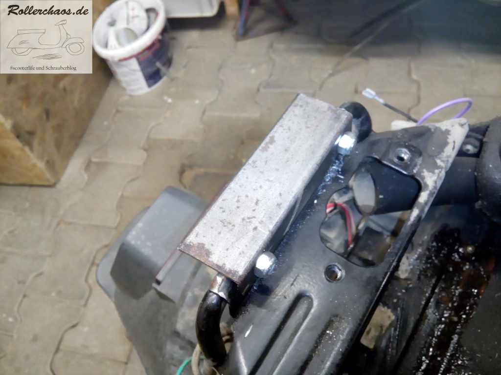 Meine Eigenbau habe ich darum entfernt und das Originalteil probeweise angesetzt. Die unteren Anschraubpunkte teilt sich der Träger mit dem Spritzschutz, ein wenig Nacharbeit war darum nur an der oberen Aufnahme erforderlich.