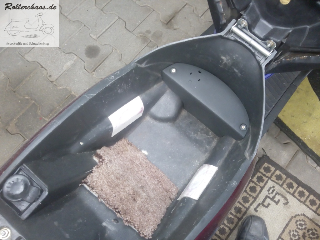 Hier hilft nur, das Helmfach vom Roller und den Teppich vom Helmfach zu trennen. Zurück blieben leider die uralten Reste von doppelseitigem Klebeband.