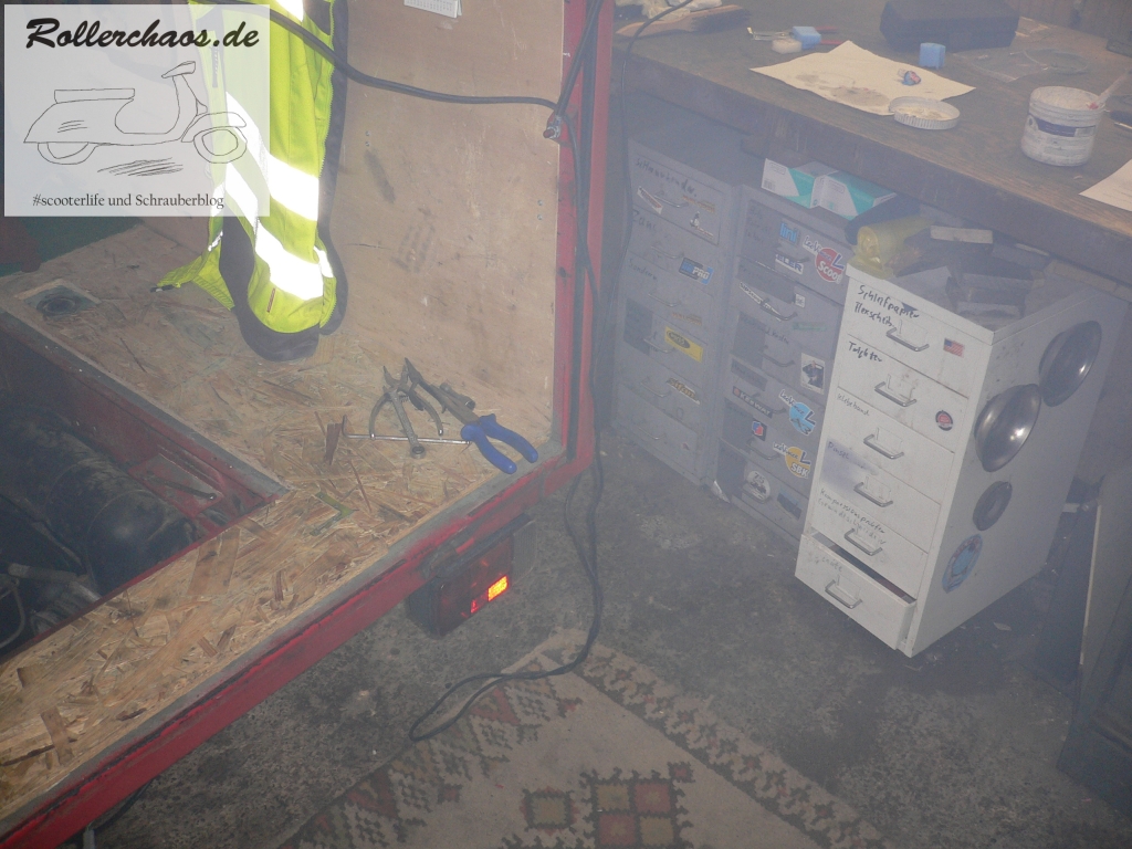 Mit neuen Reifen und frischem Öl im Motor, sowie den anderen Servicearbeiten abgehakt, ging es dann an die Schadensaufnahme. Es scheint, als wäre doch einiges zu Bruch gegangen. Sicher fahrbar ist die Ape wohl vorläufig trotzdem, aber eine Zeitnahe Instandsetzung ist dennoch angeraten. Jetzt heißt es warten, auf Michaels genauen schriftlichen Voranschlag und dann auf die Reaktion der Versicherung.