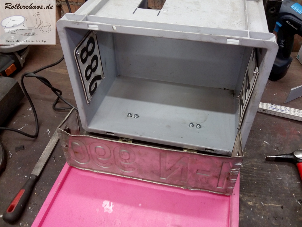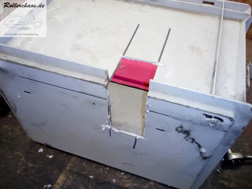Wobei der Halter selbst nicht das Problem ist, sondern der Kunststoff der Kiste. Das hatte es einfach verzogen. Es hilft also nichts, die Kiste muss höher gesetzt werden. Das geht aber nur, wenn ein Loch hineingeschnitten wird, denn nur so ist Platz für die Diagonalstrebe der Pritsche. Eigentlich wollte ich das ja nicht, aber wirklich dicht ist die Kiste sowieso nicht und es ist auch nicht drin, was keinen Regen abbekommen darf. Also was solls?