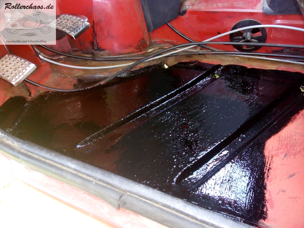 Da ich es aber für unhöflich halte, jemanden unnötig an einem völlig verdreckten Fahrzeug schrauben zu lassen, ging es anschließend an eine gründliche Reinigung der Ape. Der Motor ist nicht 100% trocken, also kam zunächst die Verkleidungswanne ab.