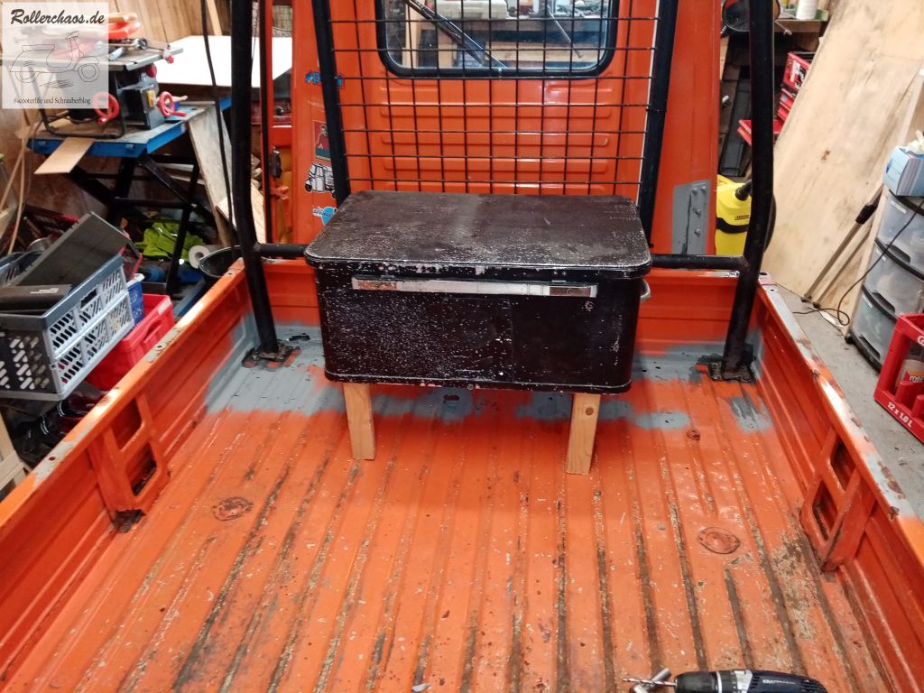 Überhaupt waren die heutigen Arbeiten damit fast abgeschlossen. Was noch fehlte war die Alubox, die auf der Ladefläche montiert sein sollte.
