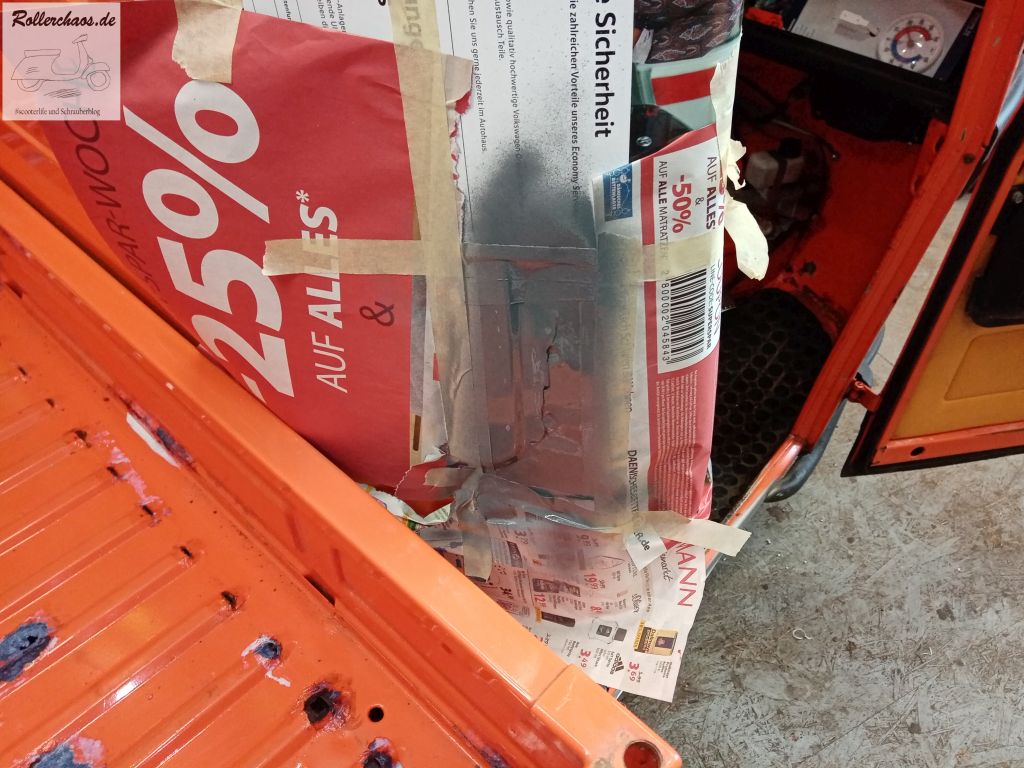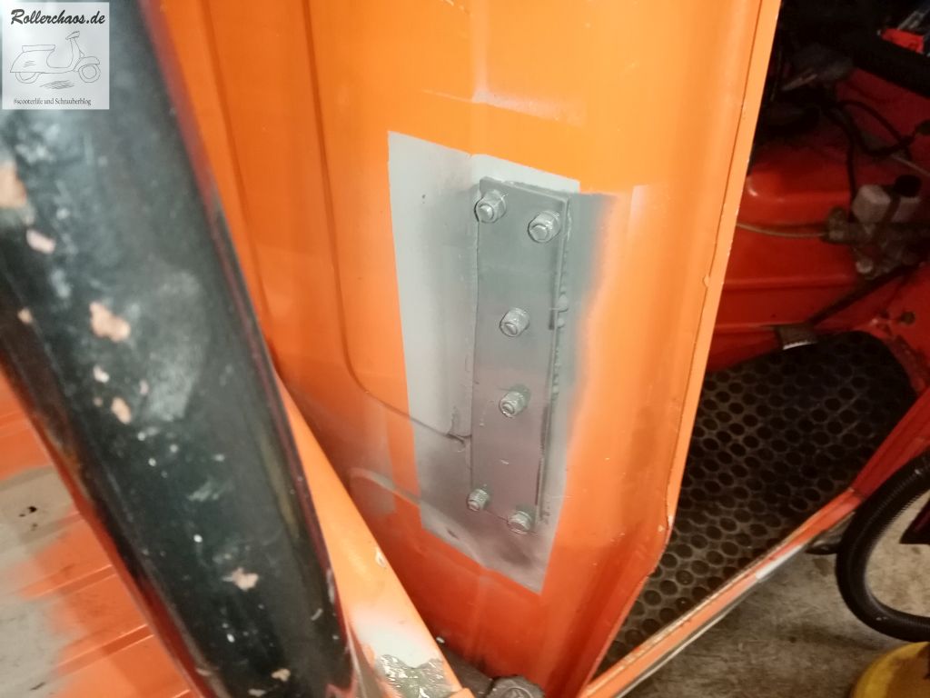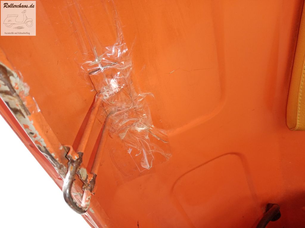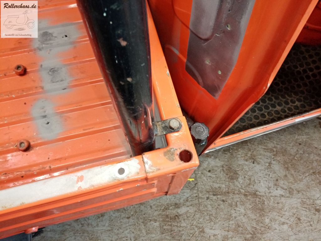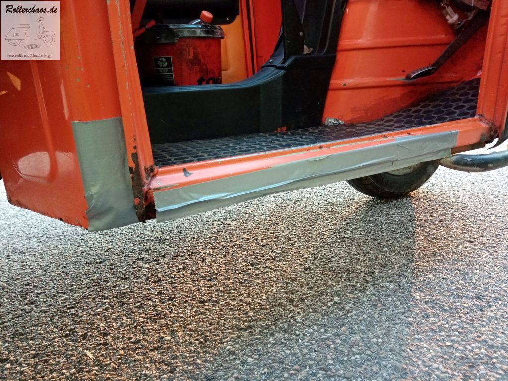 So ist auch hier die Kabinenrückwand im Bereich des Fallenbügels für die rechte Tür gerissen. Eine Standardkrankheit bei dieser Ape-Generation. Hier ist ein zeitnaher Eingriff nötig, denn die italienische Lösung des kommunalen Vorbesitzers ist nicht so ganz mein Geschmack.