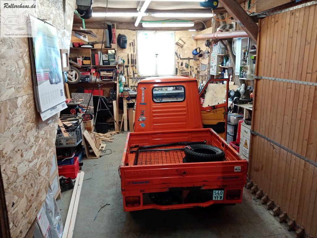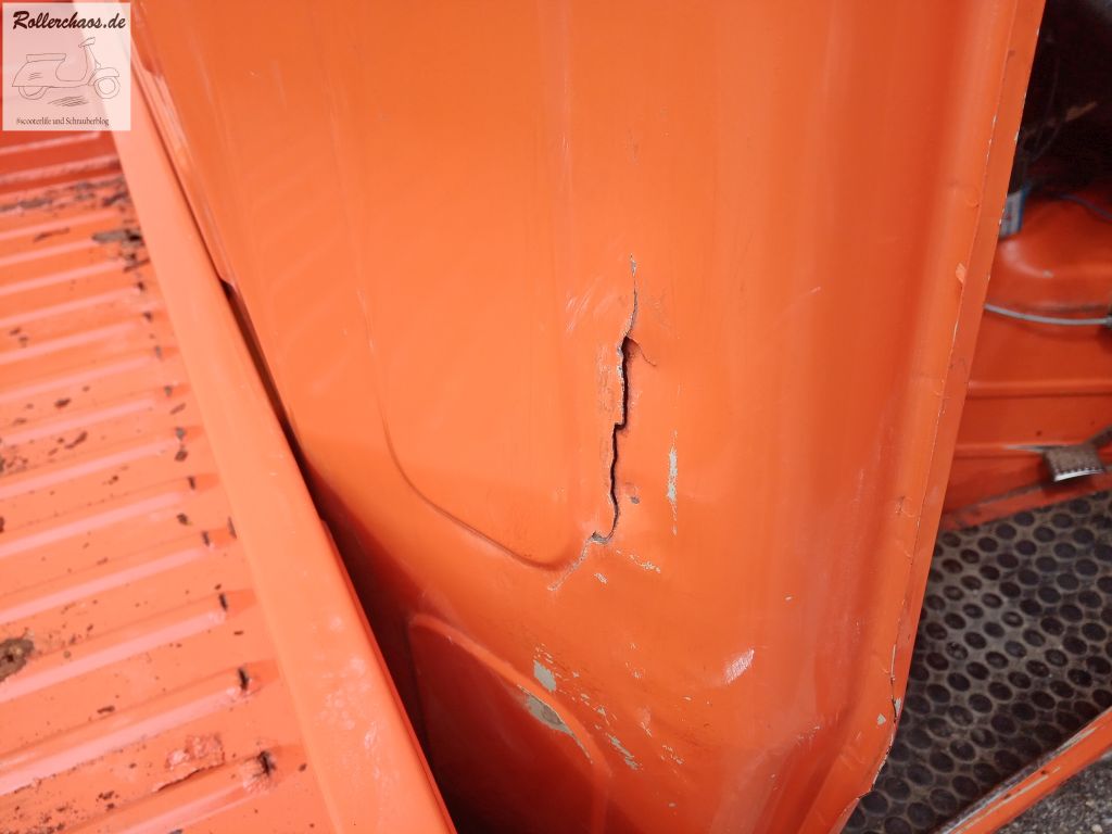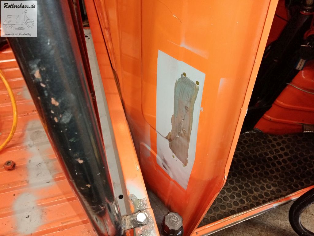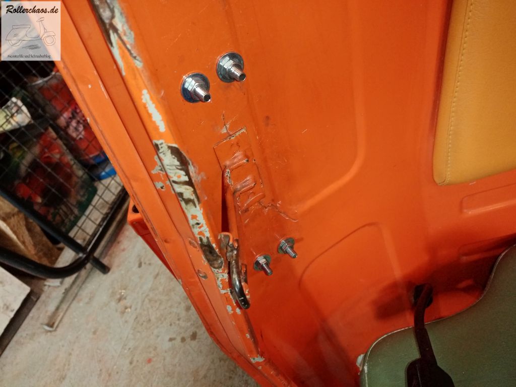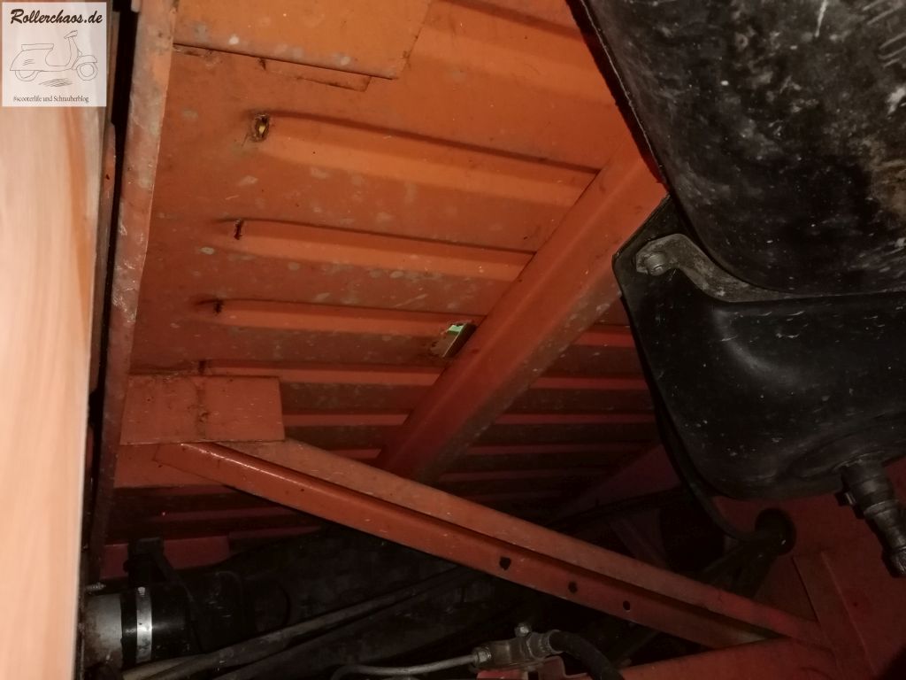So ist auch hier die Kabinenrückwand im Bereich des Fallenbügels für die rechte Tür gerissen. Eine Standardkrankheit bei dieser Ape-Generation. Hier ist ein zeitnaher Eingriff nötig, denn die italienische Lösung des kommunalen Vorbesitzers ist nicht so ganz mein Geschmack.