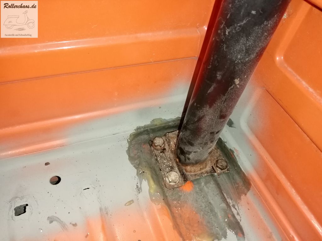 All die Bohrerei sorgt natürlich für neue, potentielle Rostnester. Darum kam die Platte nochmal runter und der Bereich wurde erneut grundiert. Diesmal von innen und außen.