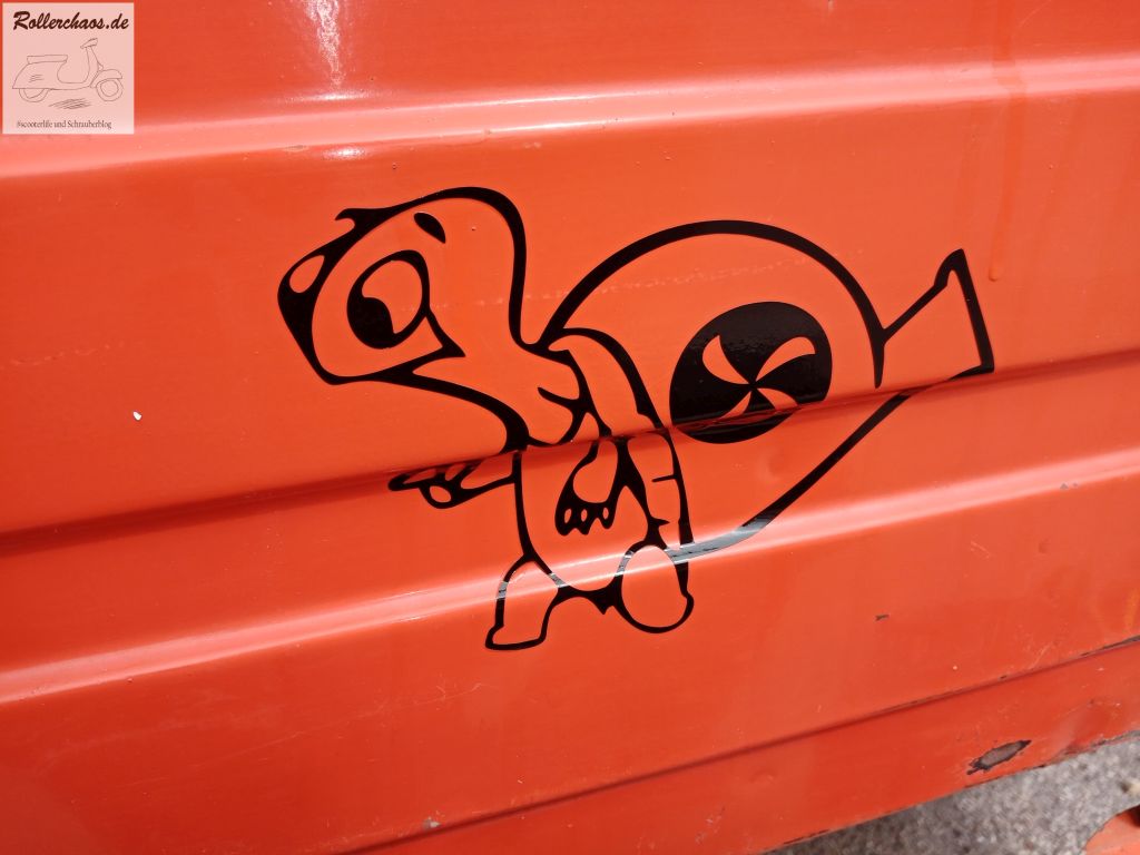 Warum Tartaruga, als Schildkröte auf Italienisch? Nun, aus irgendwelchen Gründen war eine blaue Gummischildkröte als Beigabe bei diesem Fahrzeug dabei. Was auch irgendwie passt, denn das Fahrzeug gehört zur höchst seltenen Spezies der unfrisierten Ape 50, ist also grauenhaft langsam.