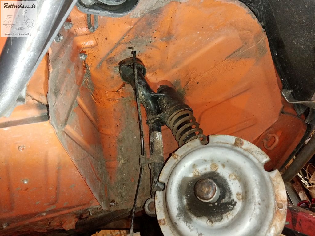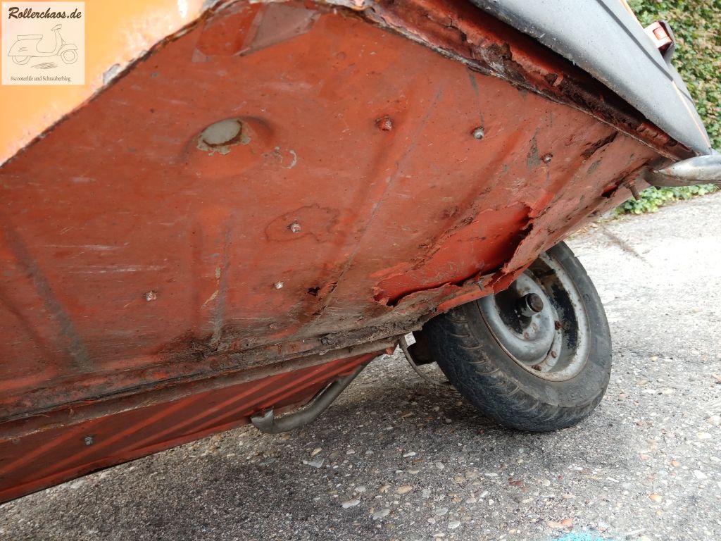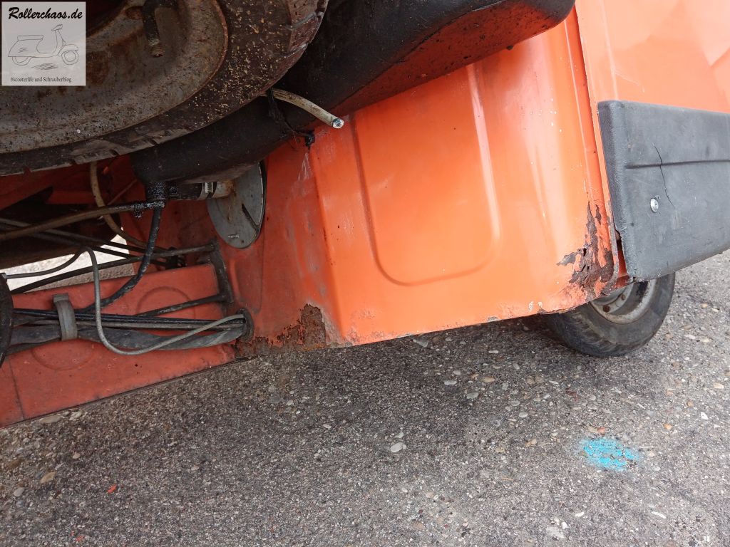 Außerdem war natürlich die Gelegenheit günstig, die Rostschäden genau zu begutachten. Der Radhausdom vorne ist erstaunlich gut erhalten und fast rostfrei. Lediglich rechts unten, am Übergang zum Bodenblech ist ein kleines Loch.