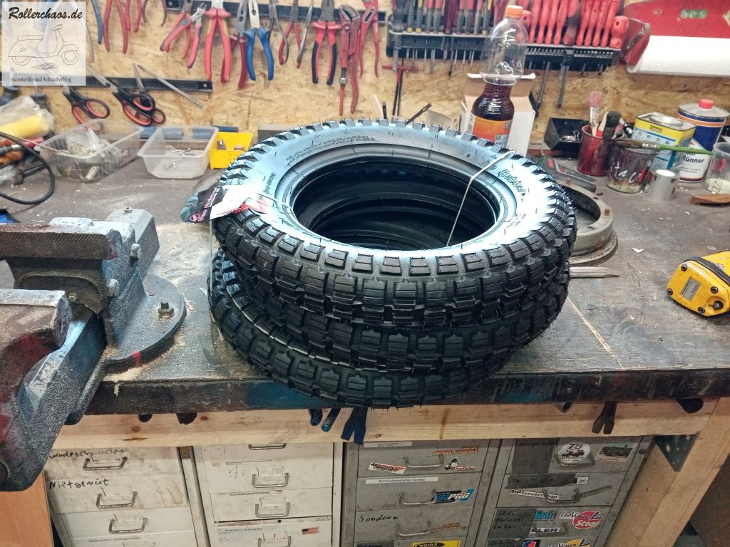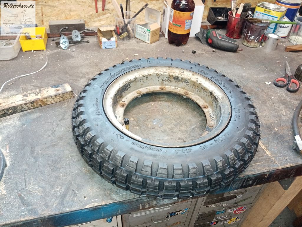 Während der Lack trocknete habe ich angefangen an der Fuffi zu schrauben. Als erstes stand eine Arbeit auf dem Programm die ich nicht sonderlich mag: Reifenwechsel.