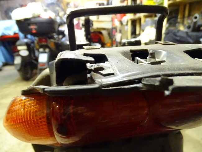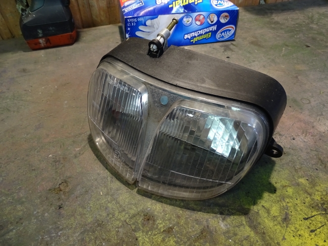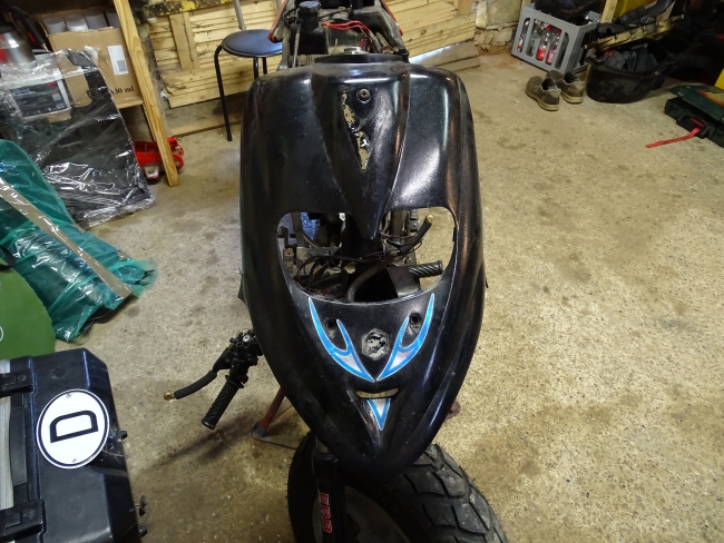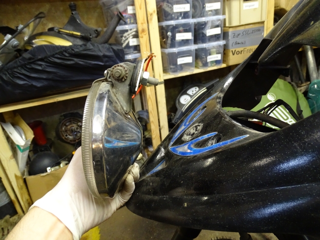 Eine Idee die Maik und ich durchgegangen sind um diese Sache zu lösen, ist die Montage eines zusätzlichen Fernscheinwerfers am Roller. Um das durchzuspielen habe ich zunächst die Frontmaske des Rollers wieder angebaut.