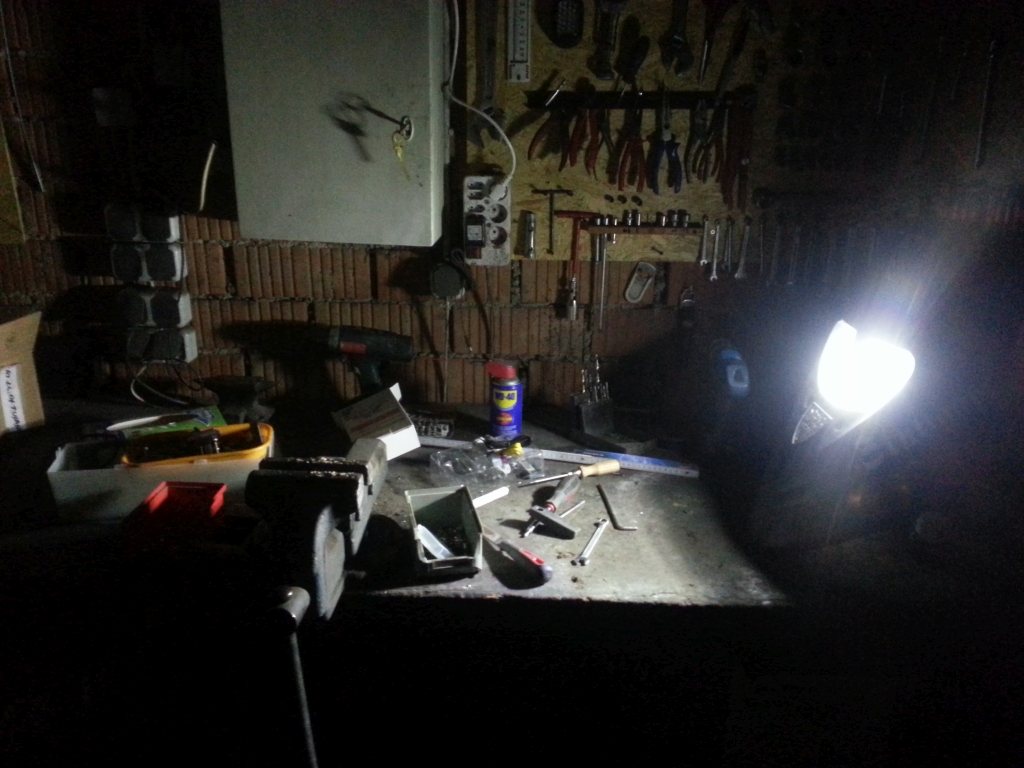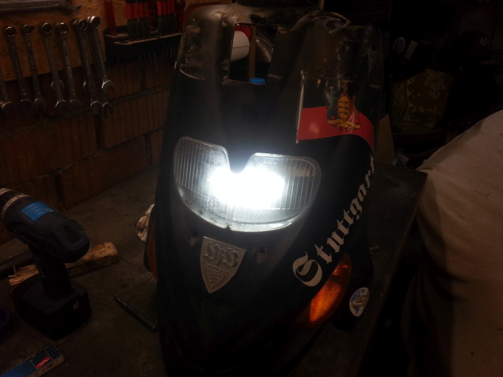 In der Praxis gehen die TFL vermutlich als Originalscheinwerfer durch, der dicke Eumel oben drüber als Zusatzlicht. Glücklicherweise hat der Stalker ja ab Werk eine Positionslampe, deren Schaltung werde ich für die TFL anzapfen und somit entsprechende Schaltungen realisieren können. Im Dunkeln sitzen wird Maik jedenfalls nicht, d.h. er wird immerhin sehen können, gegen welche Treppe er fährt bzw. auf welchem Eselpfad er liegen bleibt
