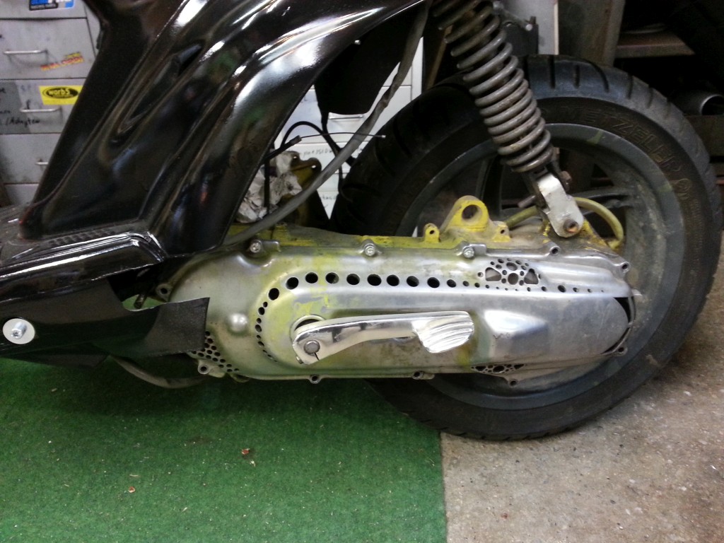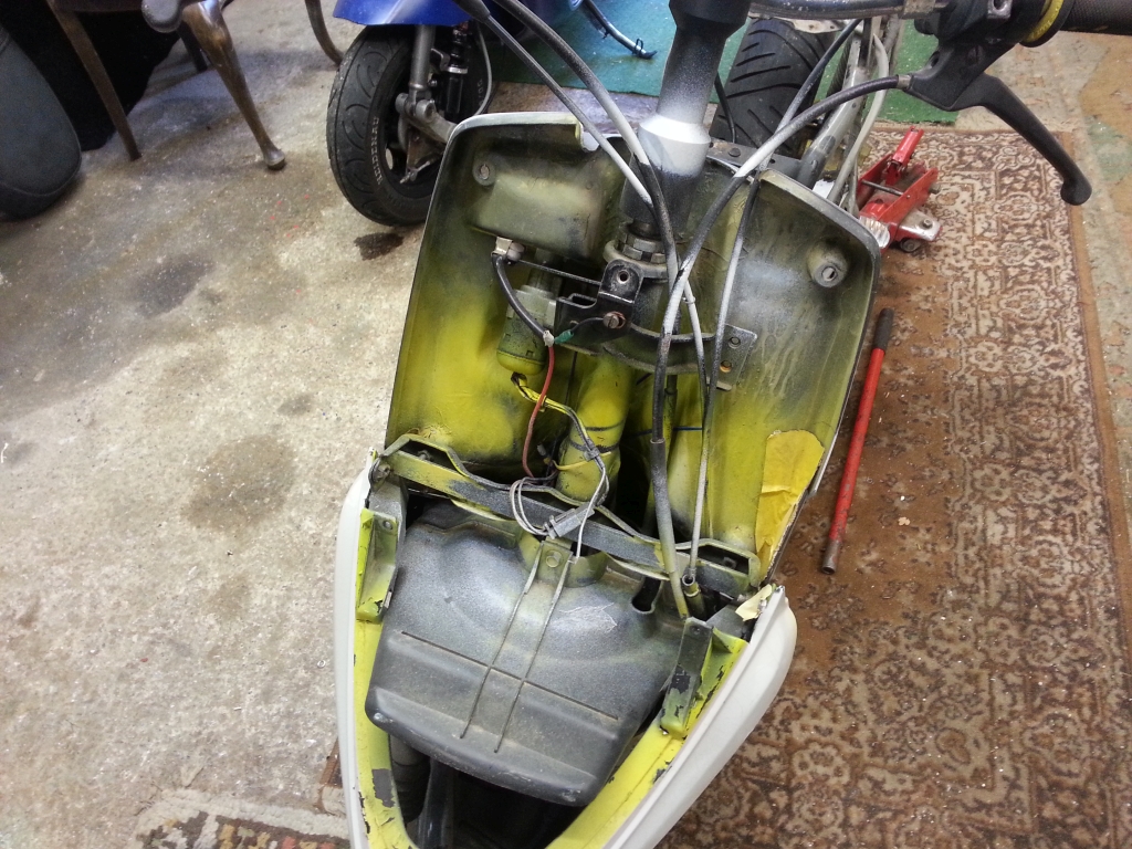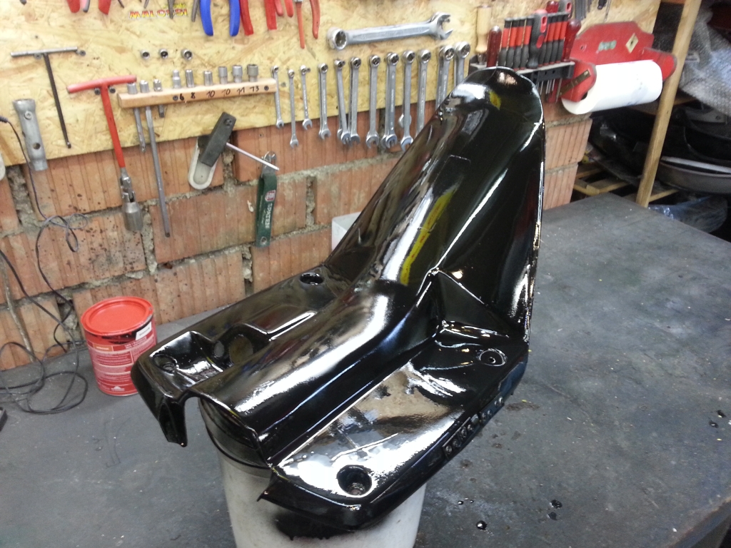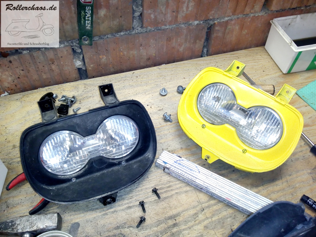 Kosmetisch machen die schwarz lackierten Teile der äußeren Verkleidung schon einiges her. Die Bodenwanne, das Trittbrett und das Beinschild werde ich ebenfalls glänzend schwarz lackieren, einfach weil diese Farbe da ist. Ich habe mitlerweile ein ziemlich deutliches Konzept für diesen Roller in der Birne. Vor allem habe ich dafür praktisch alles da. Technisch fehlt natürlich das meiste, darum werde ich wohl diesmal erst die Optik und dann die Technik des Rollers machen. Dieses Vorgehen wiederspricht zwar eigentlich meinen Grundsätzen, ist hier aber der einfachere Weg.