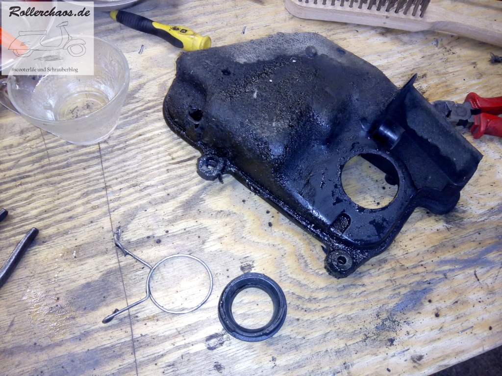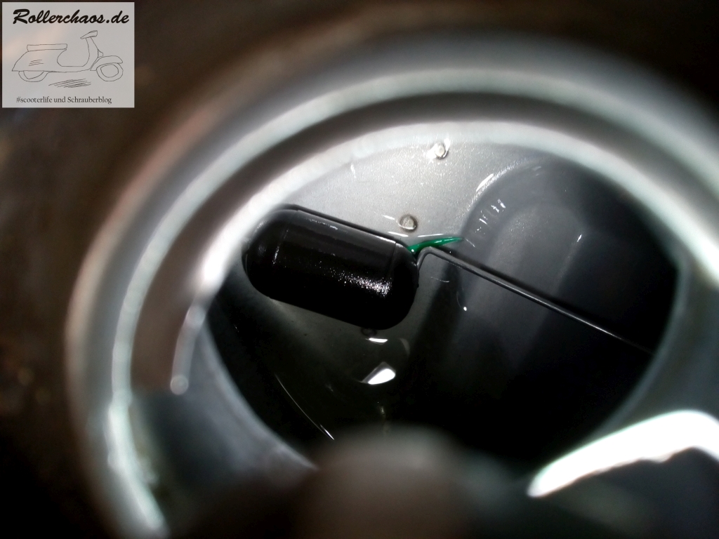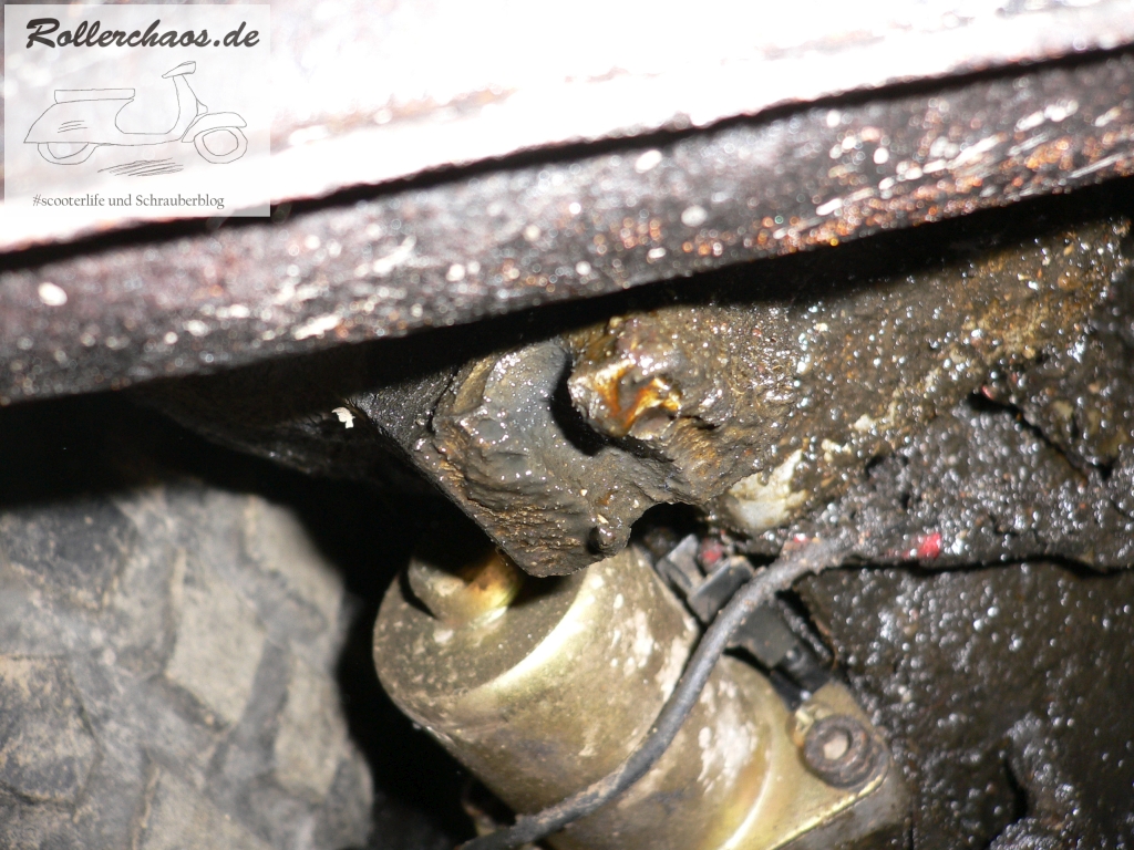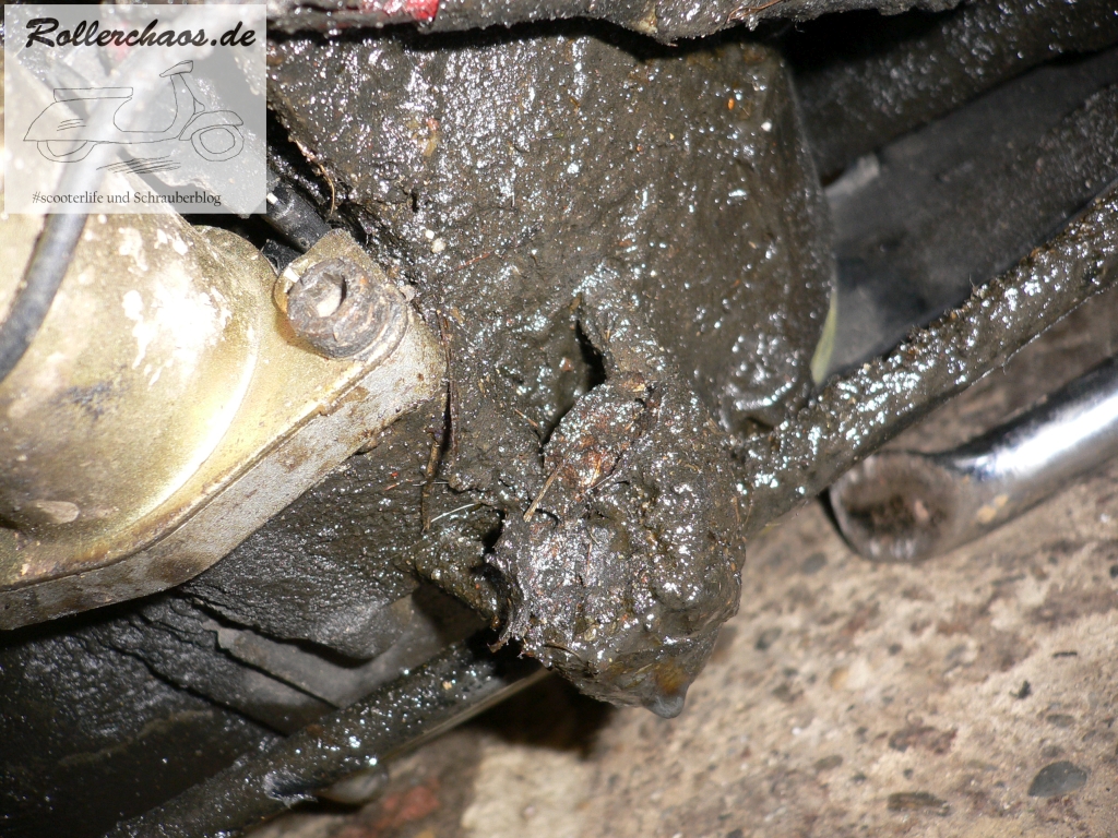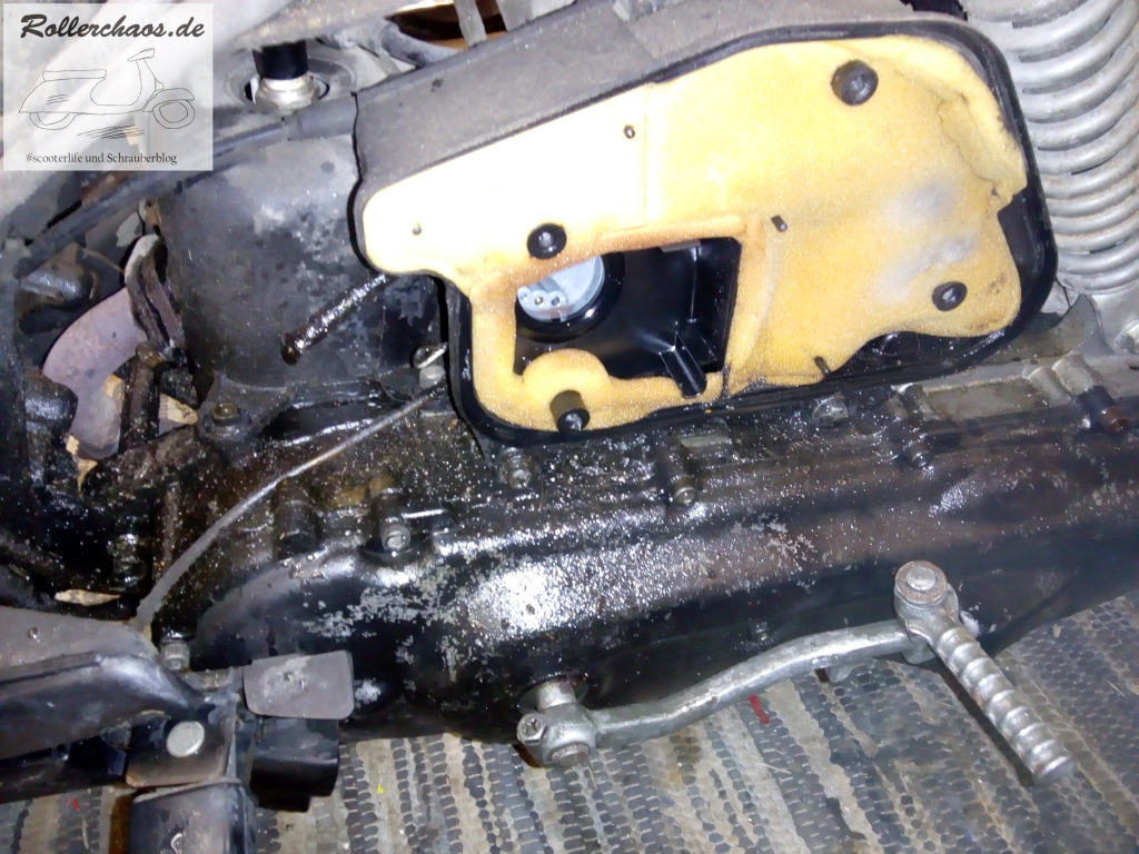 Die Schwimmerkammer stand mit Zweitaktöl voll. Kein Wunder, dass der Roller nicht ansprang. Die Erklärung dafür ist vermutlich eine defekte Ölpumpe, aber diese wollte ich sowieso rauswerfen.