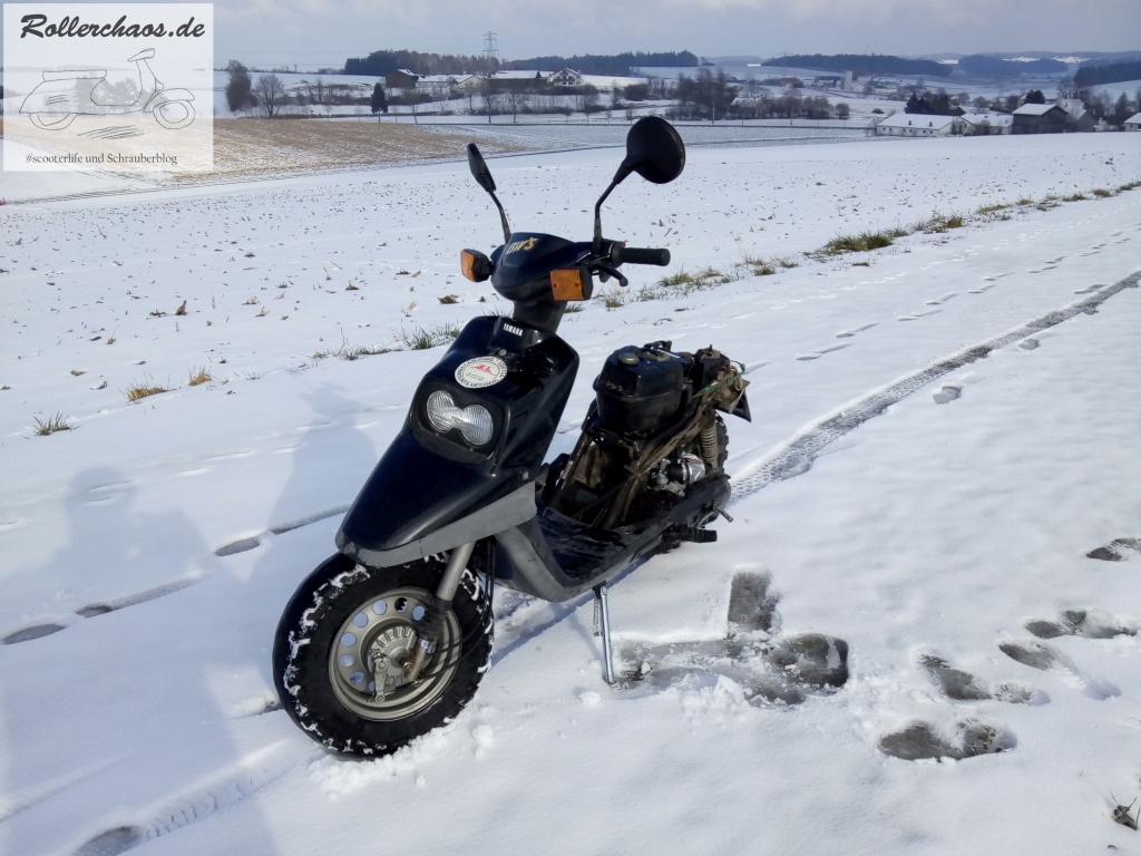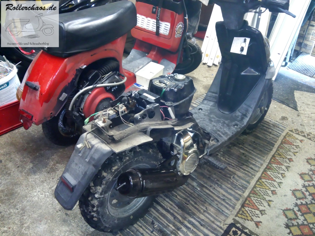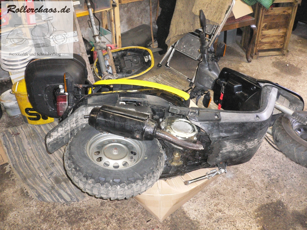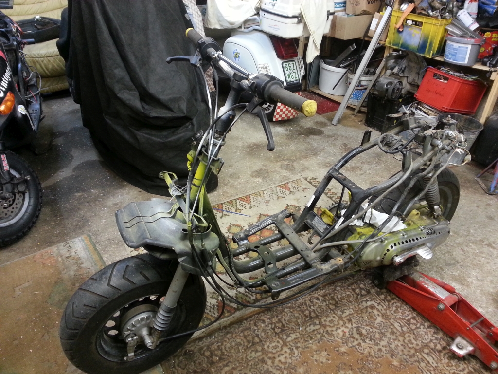 Vor allem wenn man bedenkt, dass das komplette Projekt bisher nur den sehr geringen Kaufpreis der Basisleiche gekostet hat. Ist ja alles Zeug das ich noch rumliegen hatte, bzw. die Teilespende von Michael. Gut, für den Motor muss ich jetzt dann wohl nochmal gut einen Hunderter ausgeben, aber wenn das klappt, dann wird das ein relativ billiger und sehr lustiger Spaßroller. Ich hab jetzt auch noch ein Hinterrad geschenkt bekommen, ob das wieder rein kommt oder ob ich die SR-Felge behalte hängt dann nur davon ab, für welche Reifengröße es die besseren "Ackerstollen" gibt 😉