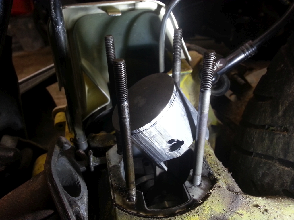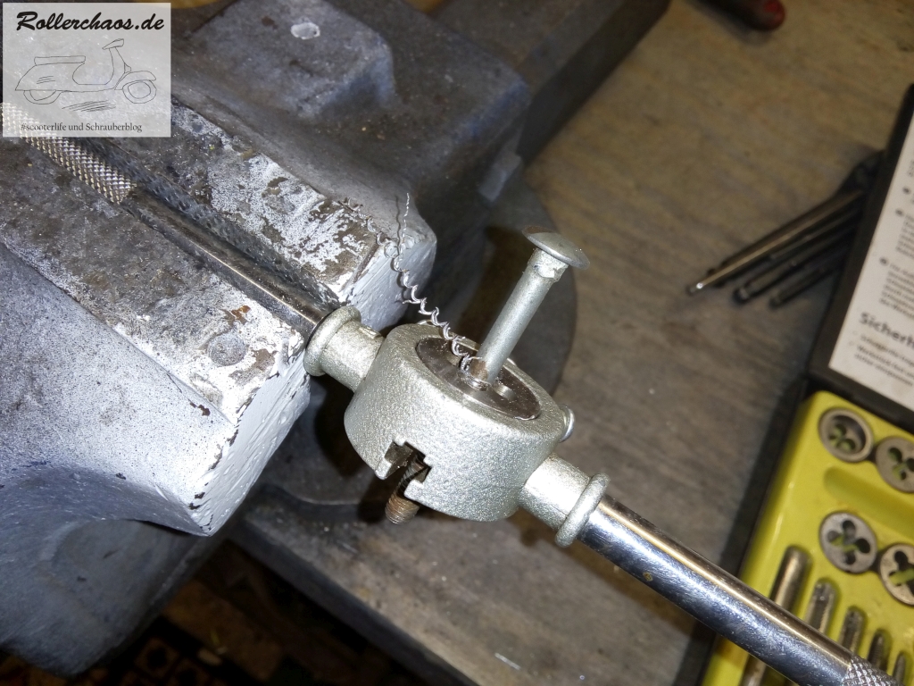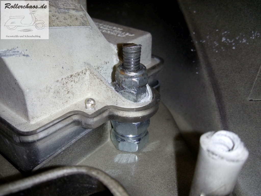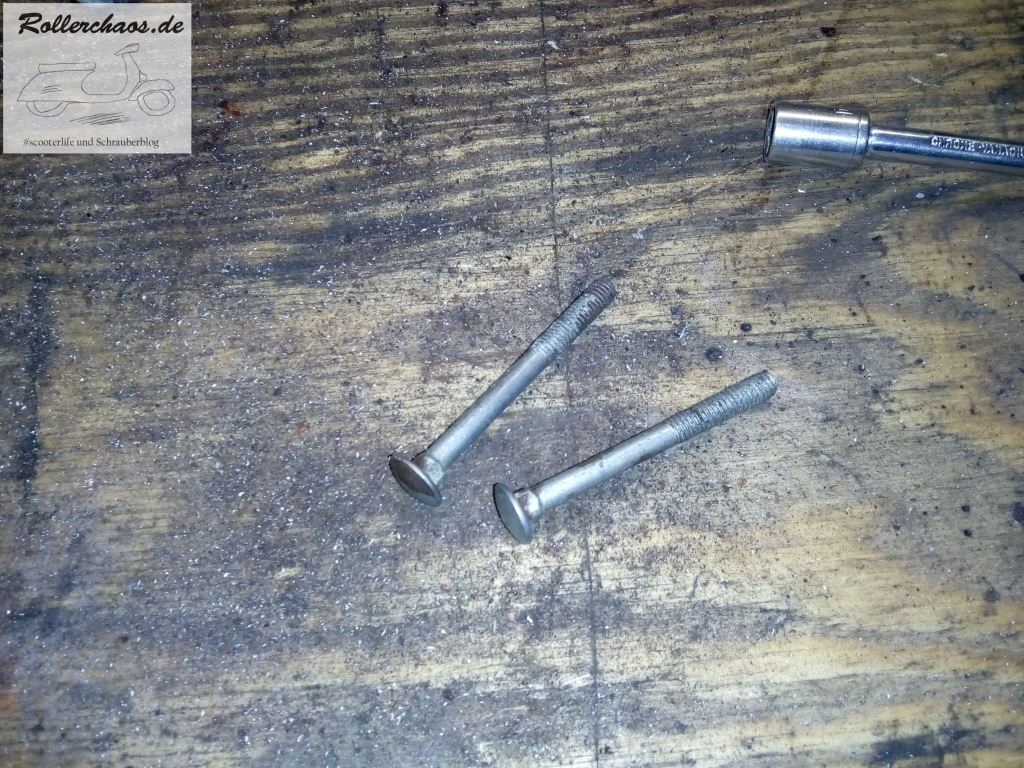 Mit dem Ständerbolzen sieht man schön, welches Stück fehlt. Ebenso sieht man, dass zum Auspuffkrümmer hin relativ viel Luft ist.