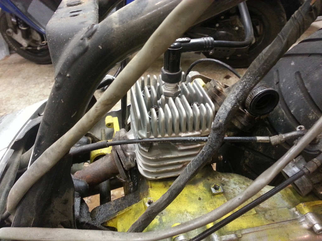 Die Zündkerze ist leider auch eine Bastelsünde des Vorbesitzers. Es ist eine völlig falsche Bosch-Type drin. Aber für einen ersten Test des Fahrzeugs langte es dann noch.