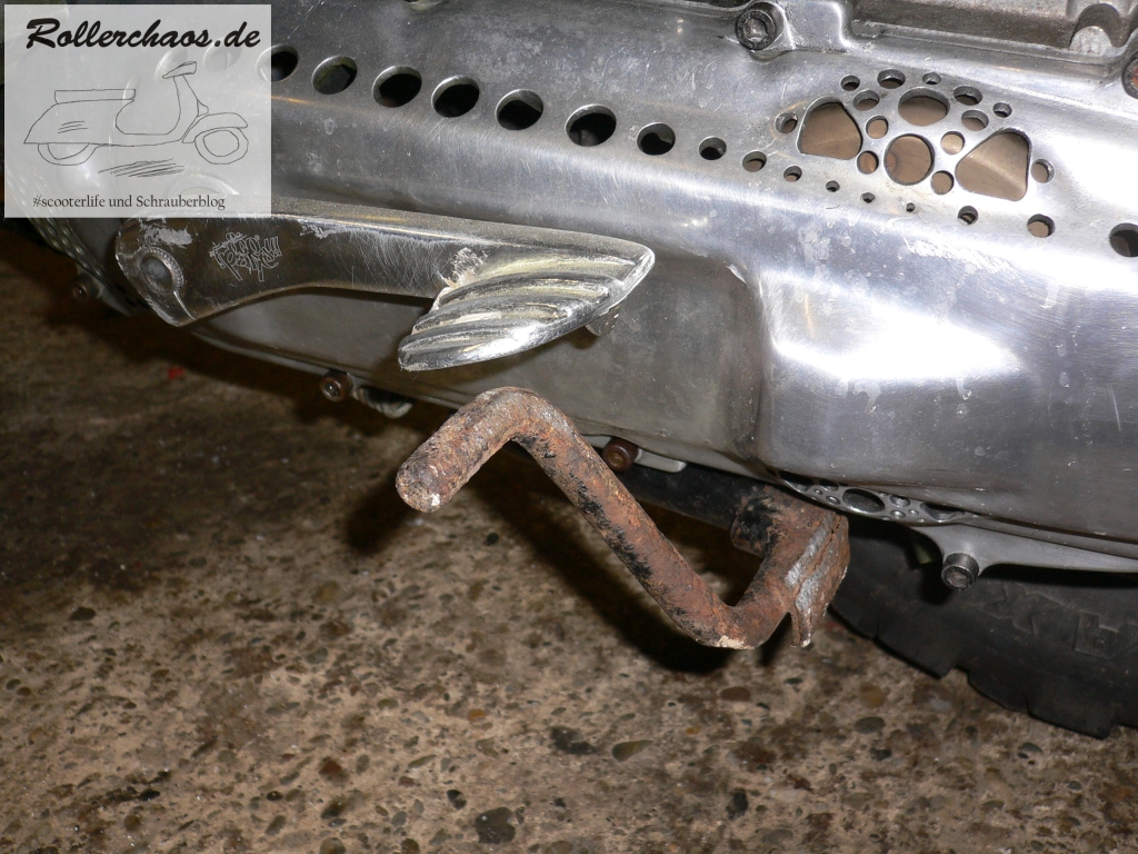 Sagen wirs mal so: der Seitenständer war ja beim Roller schon dabei und ohne ist ein Roller bei mir sowieso nicht vollständig (ich gebe ehrlich zu eine stinkfaule Sau zu sein und den Roller im Alltagsbetrieb ungern aufzubocken 😉 ), aber das passt soweit schon. Ich hatte es weder im Blog noch im Forum geschrieben: Ich habe vor dem Urlaub noch drei (!) Zubehör-Hauptständer zurückgeschickt, einfach weil sie so grauenhaft schlecht verarbeitet waren, dass ich sie auf keinen Fall anbauen wollte.