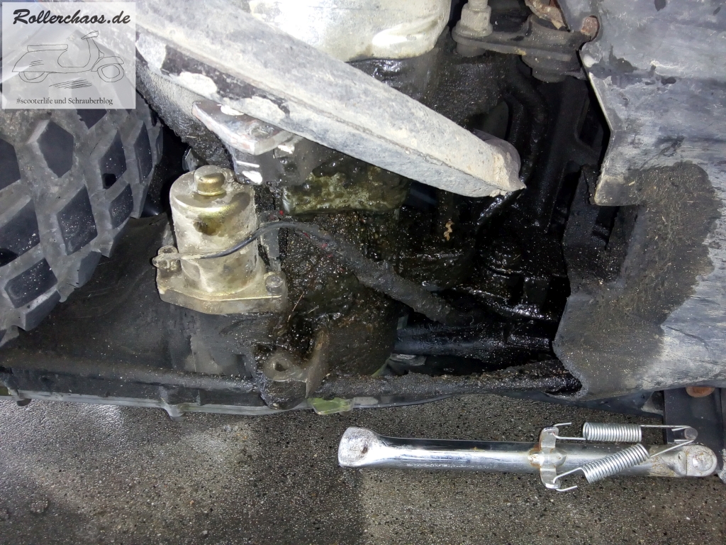 Doch bevor ich am Motor weiterforsche habe ich mir noch den Hauptständer vorgenommen. Meine Reparaturlösung hatte nämlich insofern versagt, als dass sie scheinbar eine ungesund hohe Last auf den Ständerbolzen bringt. Dieser war völlig verbogen und der Ständer baumelte heillos unter dem Roller. Darum habe ich die Stütze ersteinmal komplett entfernt, mit diesem Problem befasse ich mich später nochmal, der Motor ist letztlich wichtiger.