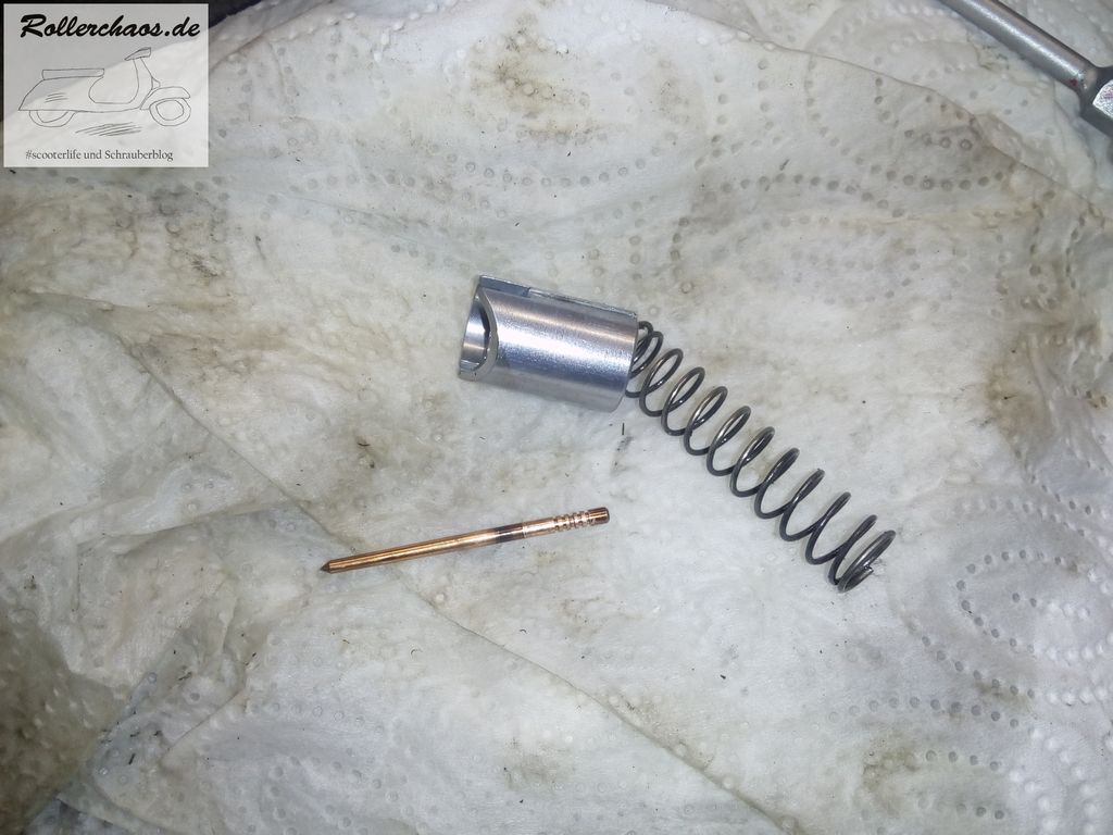 Außerdem lag die Schiebernadel lose und haltlos im Vergaser, so kann der Roller natürlich nicht ordentlich laufen. Ursache hier war eine gebrochene Drahtklammer im Schieber. Zum Glück gab der Teilefundus eine solche Klammer her.