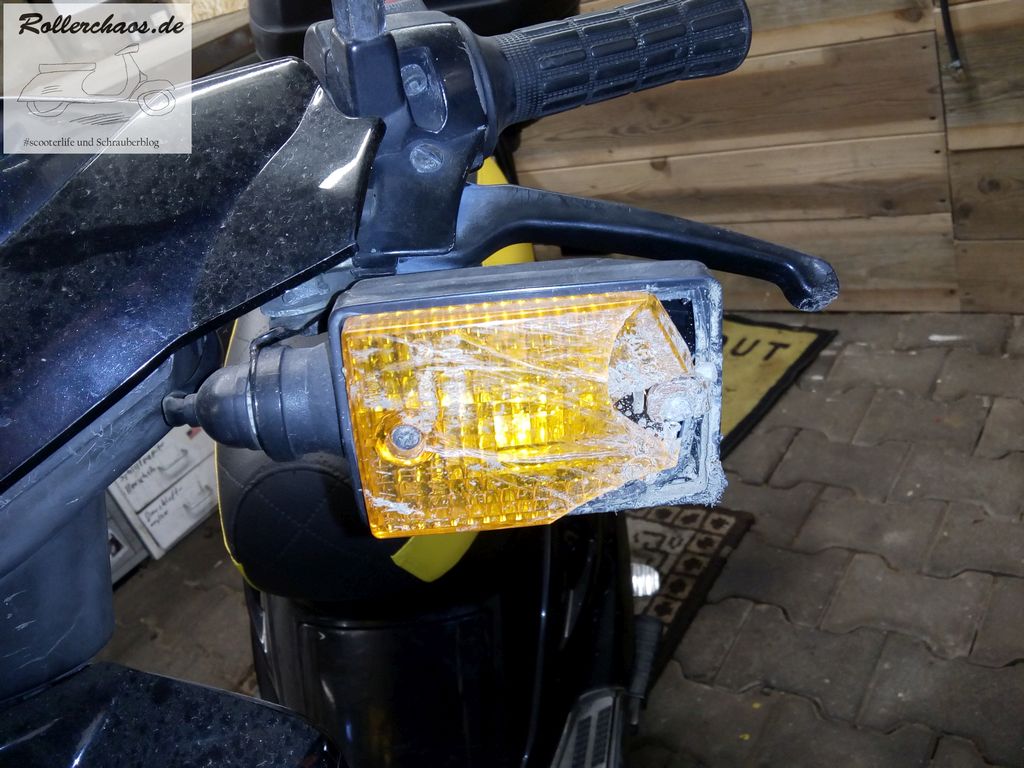Eine dieser Fahrten ging leider in die Hose bzw. in den Straßengraben. Zum Glück ohne Personenschaden, dafür aber mit etwas Bruch an der Maschine. Den vorderen linken Blinker und den Chokehebel hatte es übel erwischt, außerdem ist der linke Spiegel (der ja sowieso schon einen Riss hatte) jetzt endgültig hin.