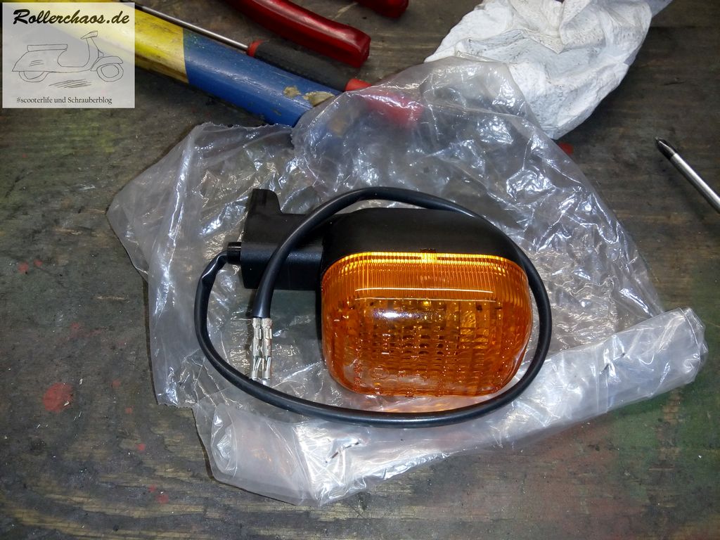 Bei den Blinkern bestand sowieso Handlungsbedarf. Die originalen Riesenteile sind ja ganz witzig, aber eben auch gruselig häßlich. Vor allem vorne, hinten passt es optisch eigentlich. Die originalverpackten Chinakracherblinker, die seit ewigen Zeiten bei mir rumliegen, sind für diesen Job eigentlich ideal. Sie sehen einigermaßen klassisch aus und ich habe keinerlei Schmerzen dabei sie zu verfusseln.